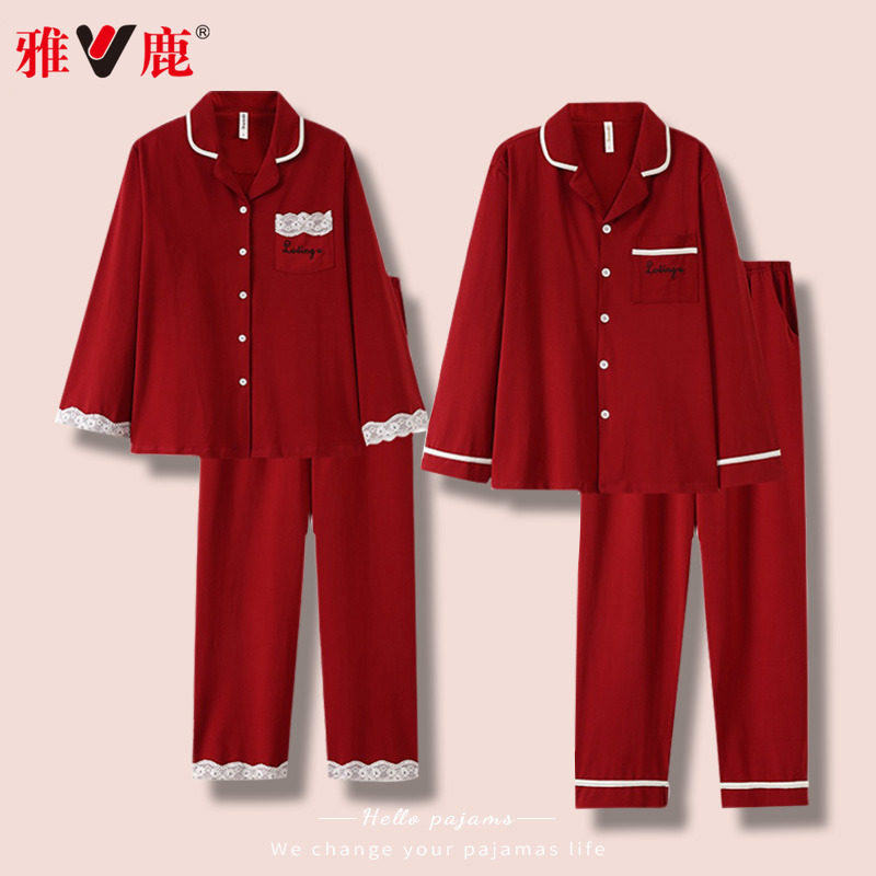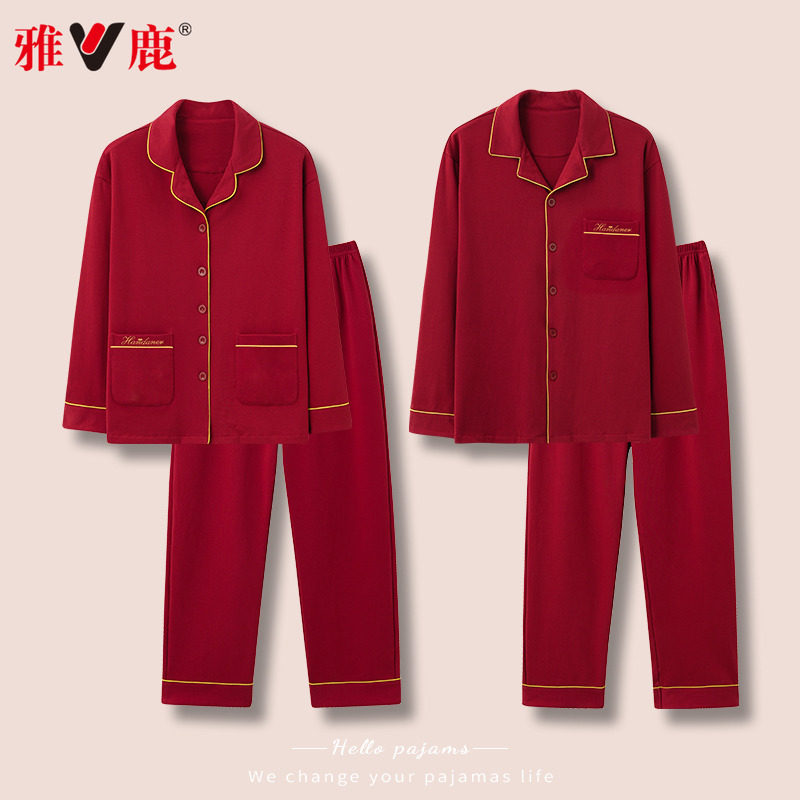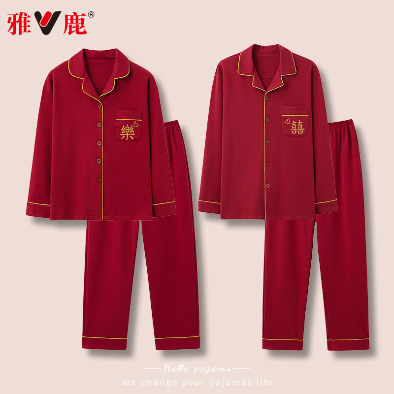 雅鹿纯棉结婚情侣睡衣新婚套装春秋款红色男士本命年家居服女秋冬