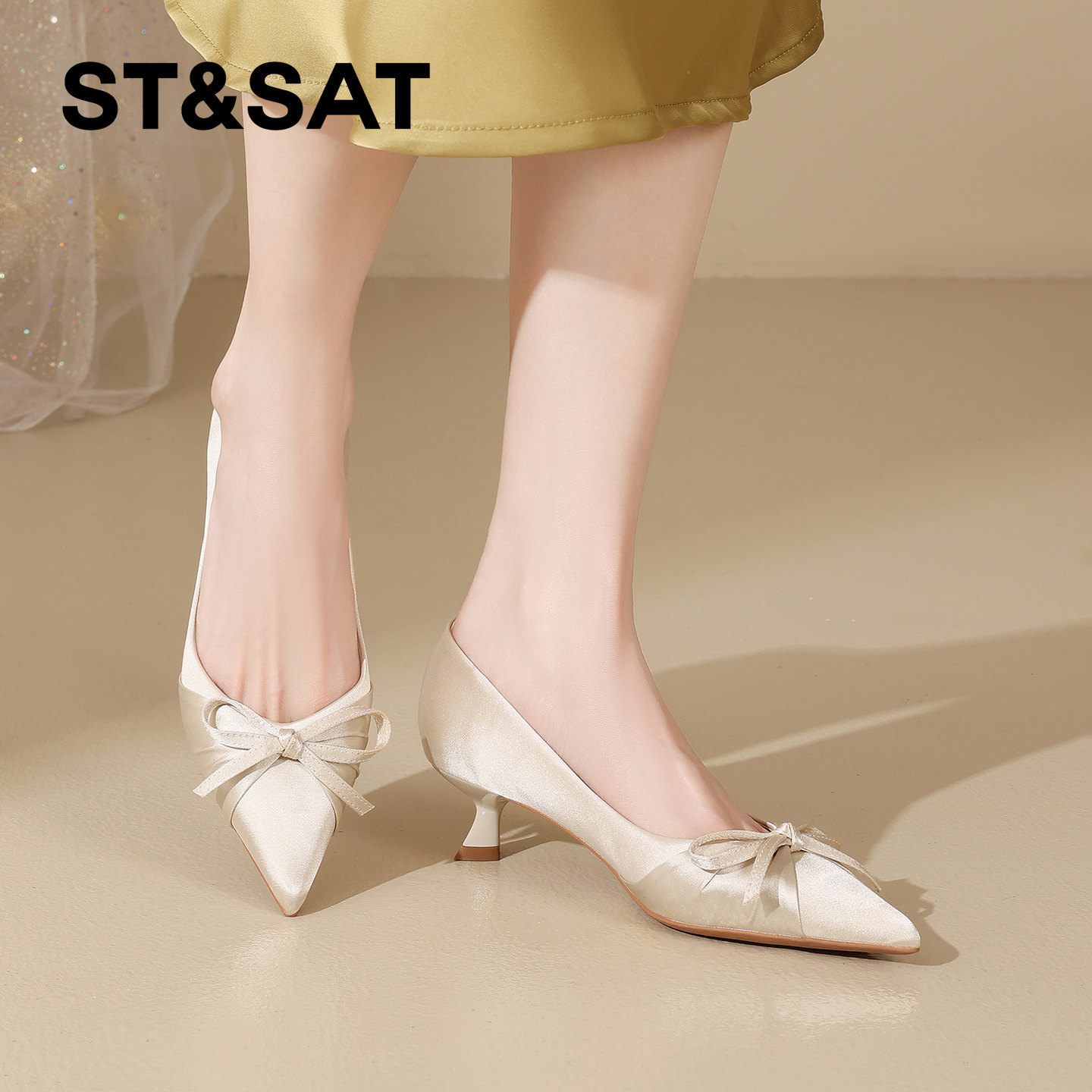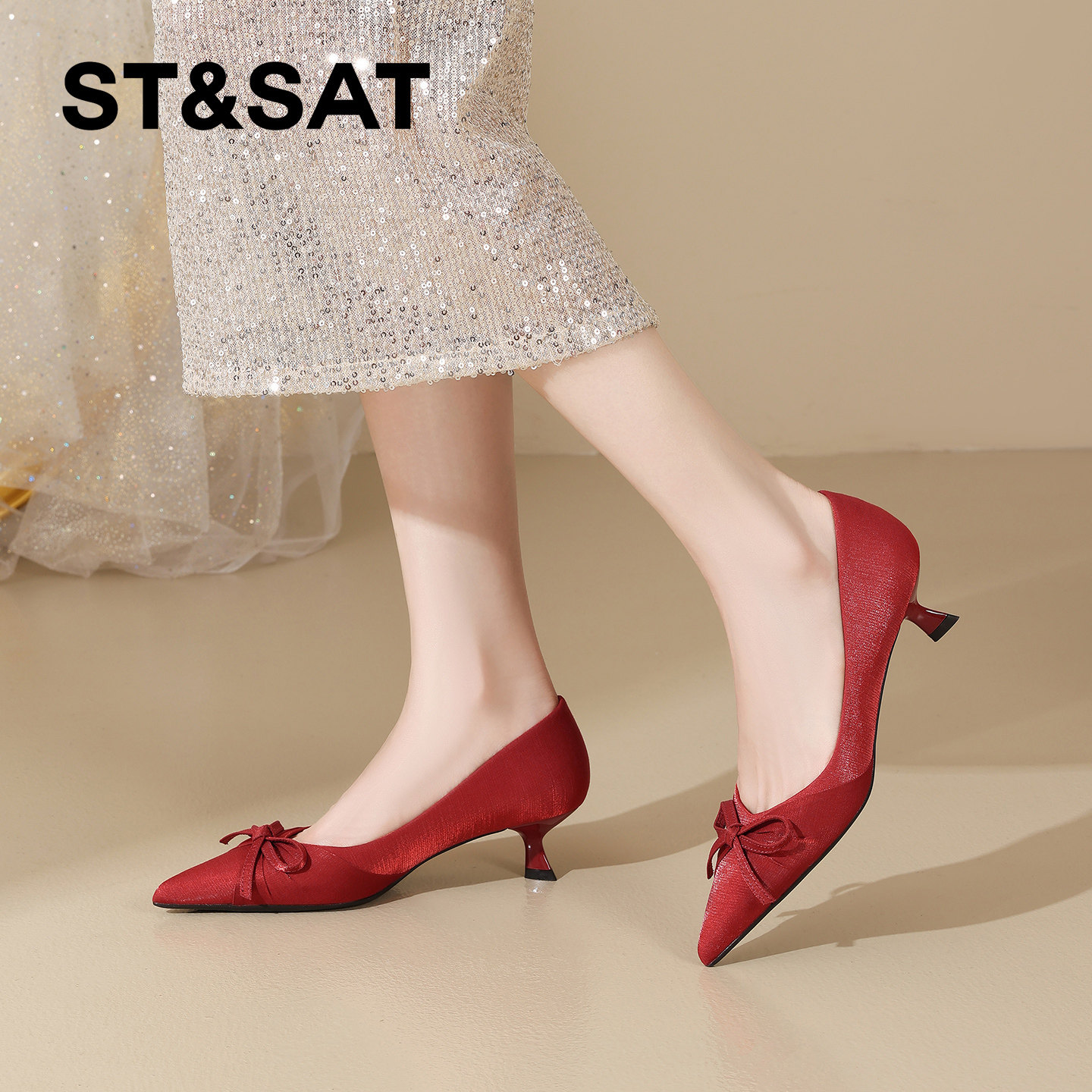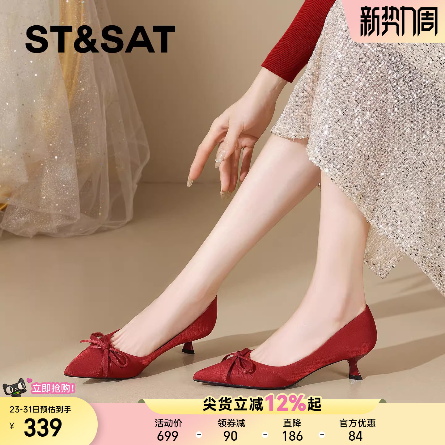 星期六红色蝴蝶结婚鞋女2026春季新款尖头细跟法式敬酒新娘鞋单鞋