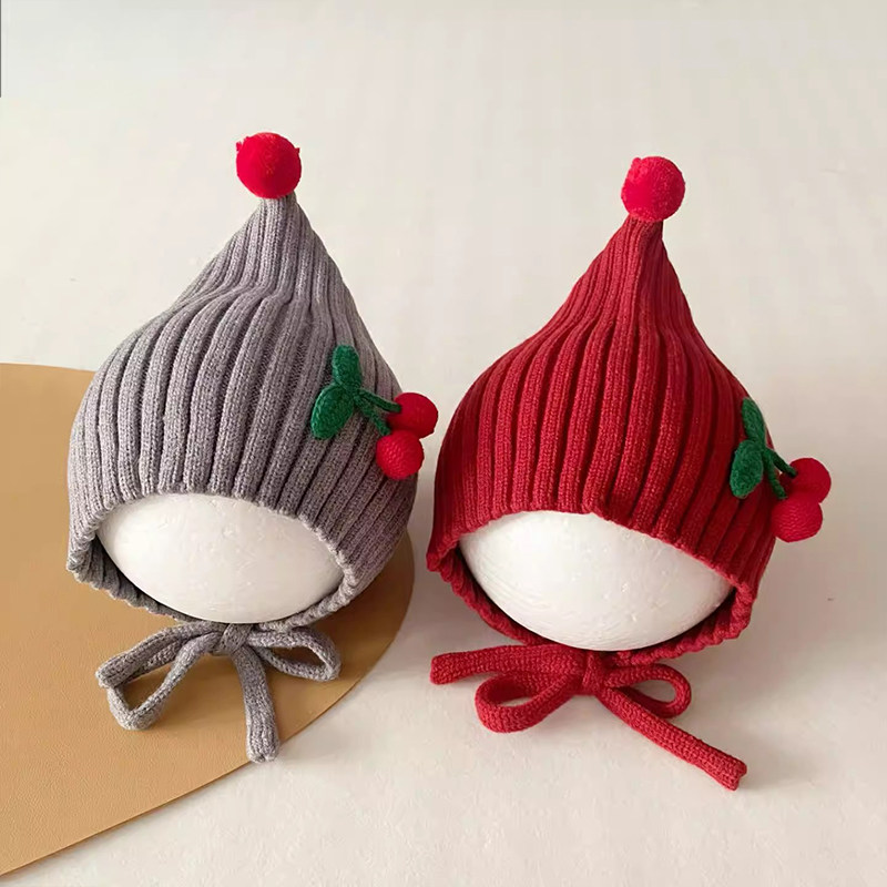 婴儿护耳帽秋冬季针织可爱球球尖尖小红帽防风保暖毛线宝宝精灵帽