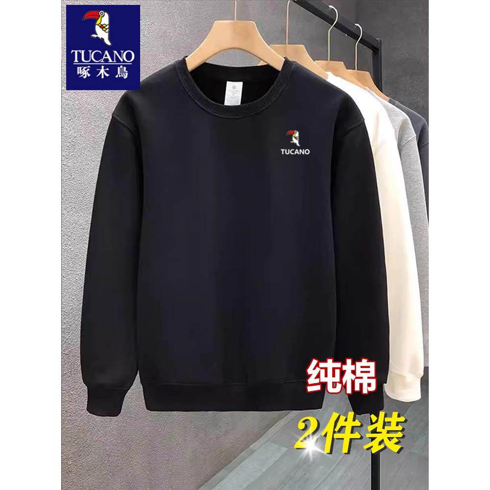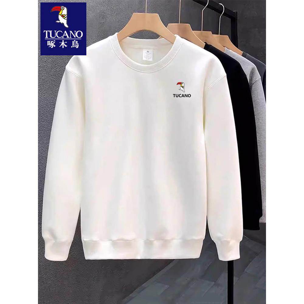 卫衣男士啄木鸟春秋冬季圆领中年男新款加绒纯棉打底衫休闲白色