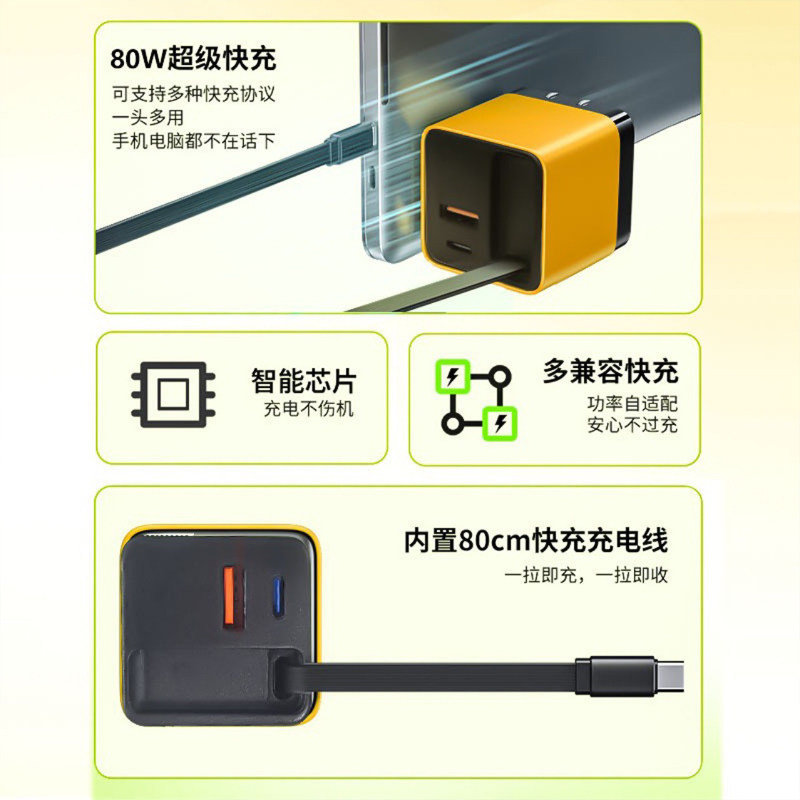 氮化镓超级快充充电器80W充电头华为充电头65W苹果充电器Type-适用oppo手机自带伸缩线手机充电器小米快充