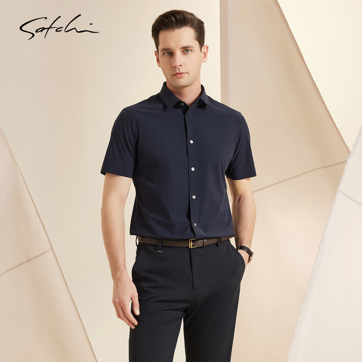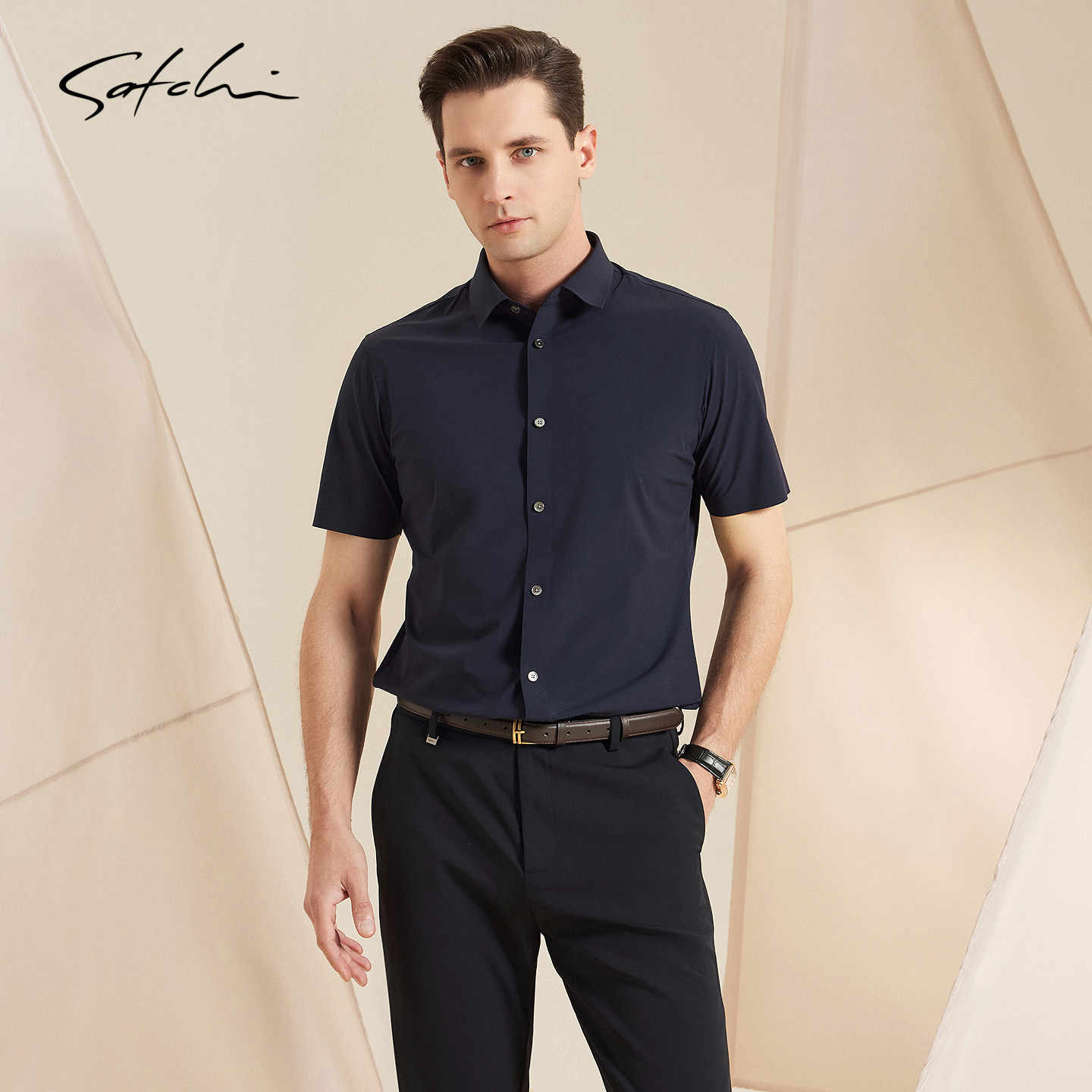 [弹力抑菌]SATCHI沙驰男装男士短袖衬衫春季新款商务休闲格子衬衣