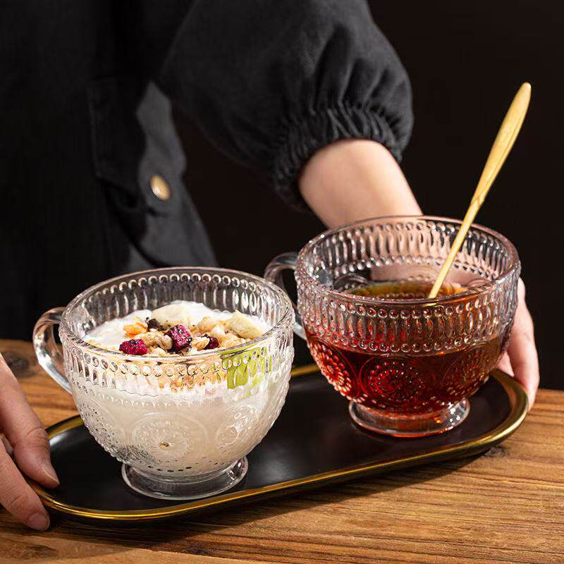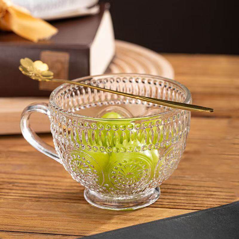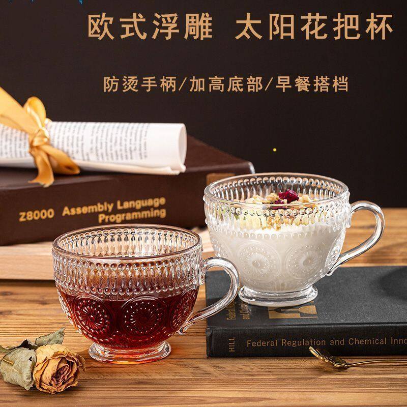 欧式浮雕透明太阳花把杯早餐杯家用牛奶玻璃杯耐高温绿水杯精致