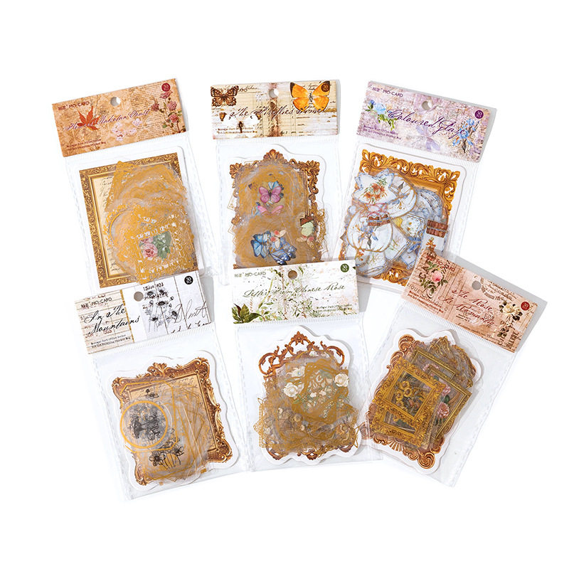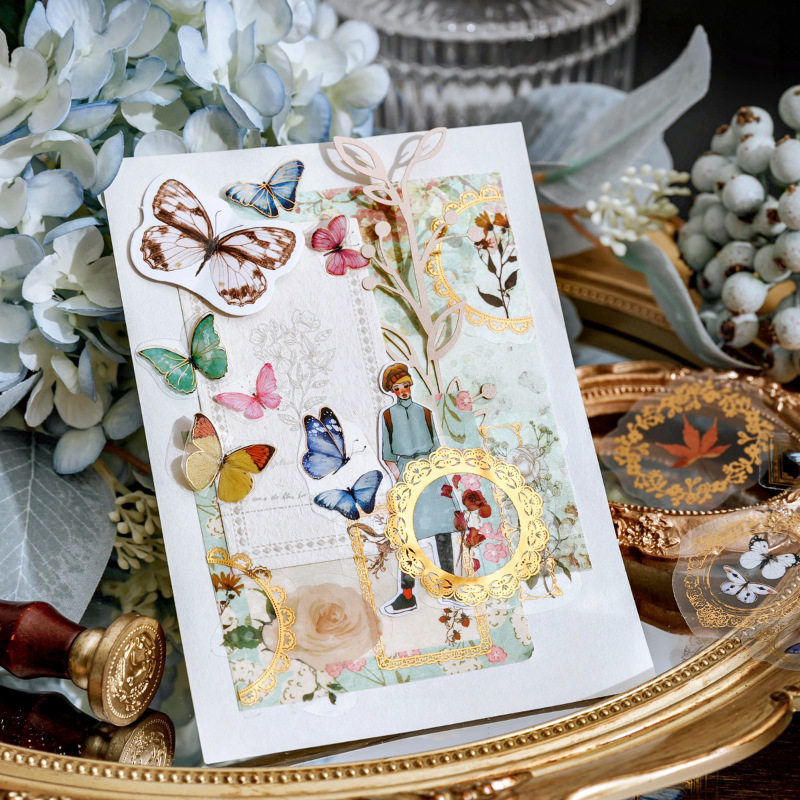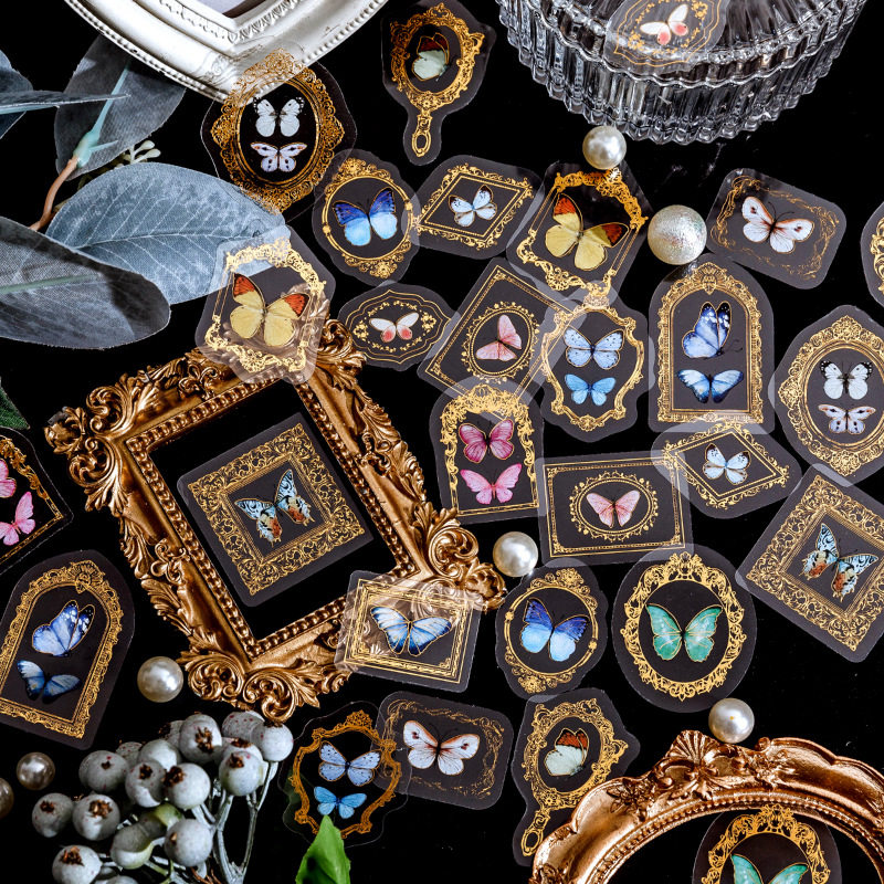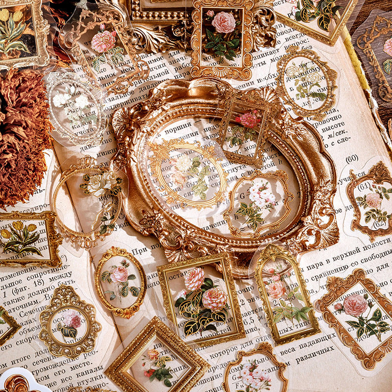 陌墨烫金pet贴纸包 复古植wu花卉花瓶蝴蝶少女心手账装饰防水贴画