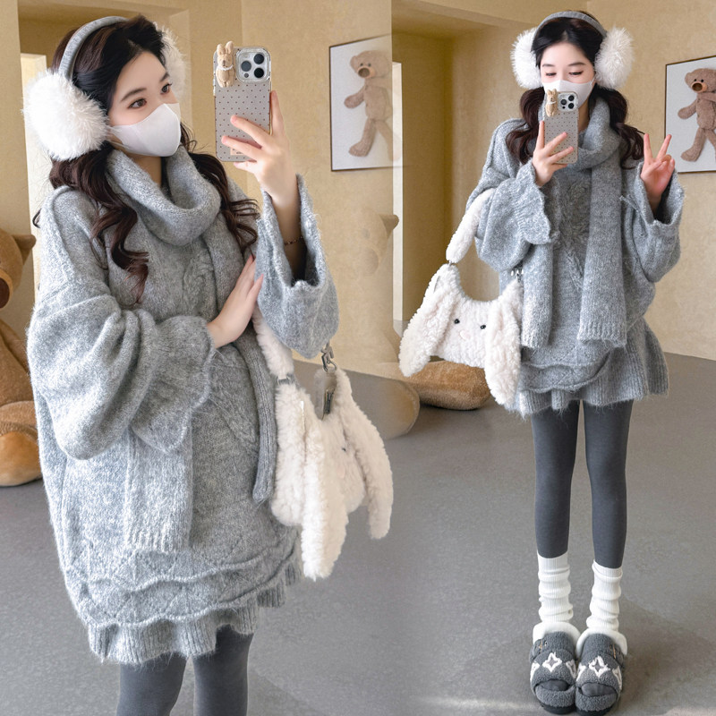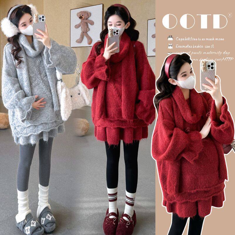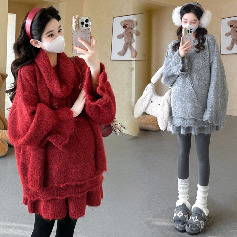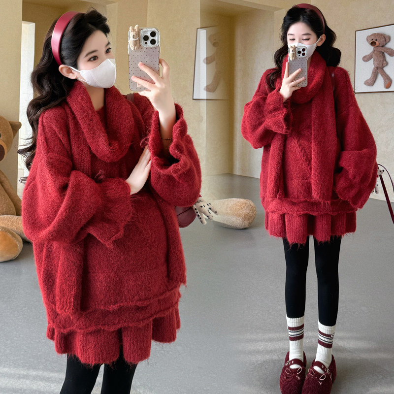 婧麒孕妇装慵懒风高领毛绒连衣裙女秋冬宽松显瘦红色长裙氛围感女
