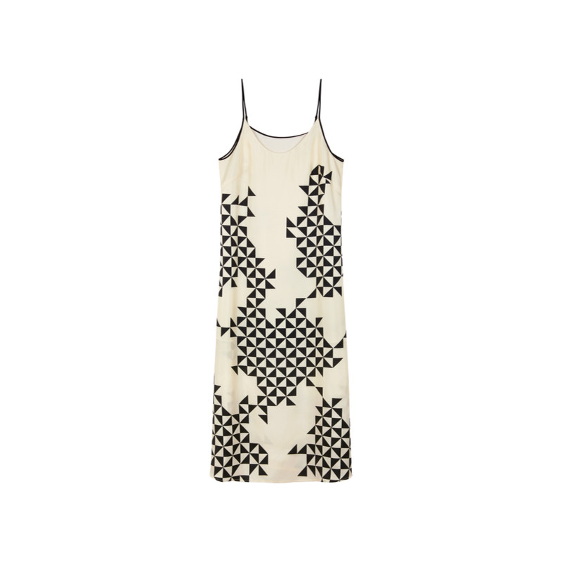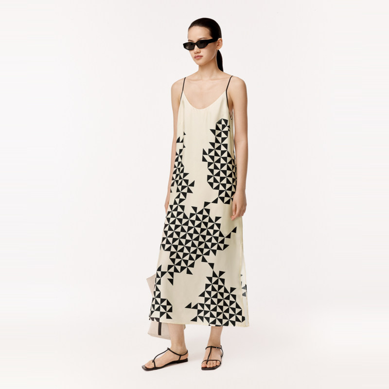 LESS夏气质桑蚕真丝吊带长款连衣裙几何图案小A摆度假风2O4G10960