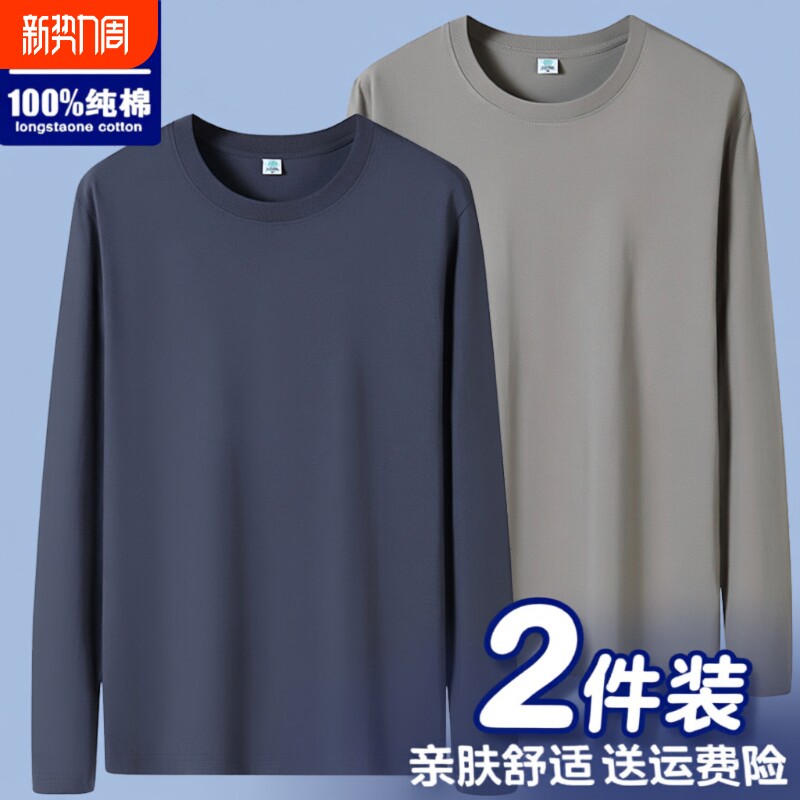 100%棉长袖t恤秋衣男圆领宽松上衣全棉体恤男女TEE打底衫纯棉白色