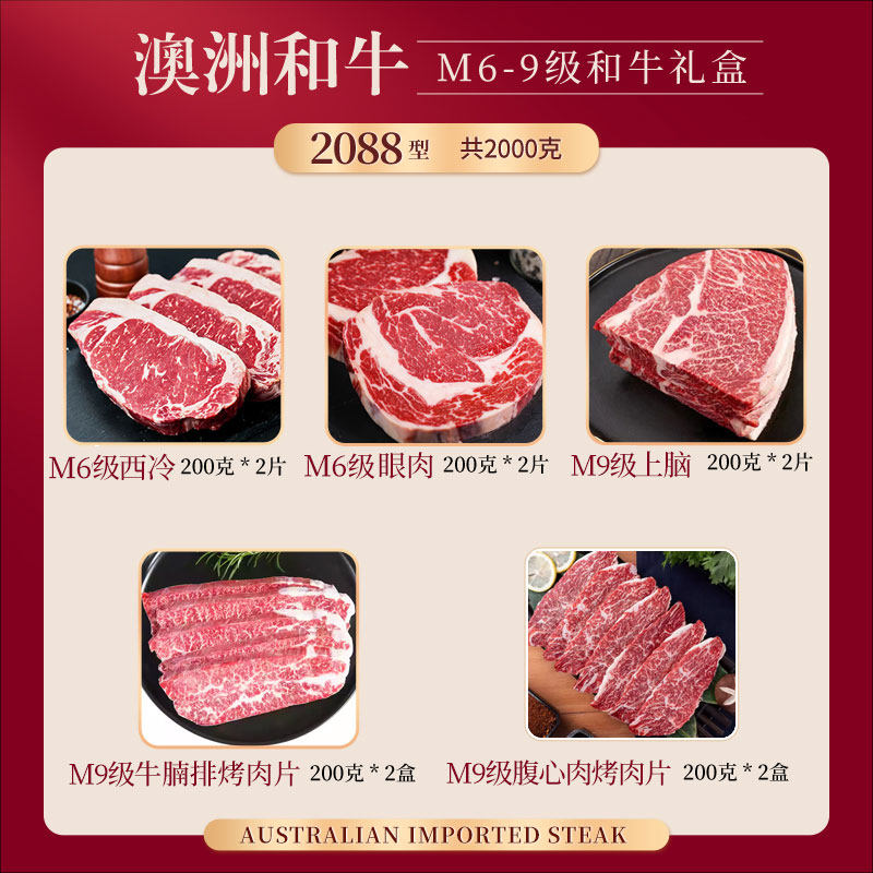 澳洲和牛M9原切雪花牛排礼盒2088型牛肉上脑西冷眼肉2000g商务礼