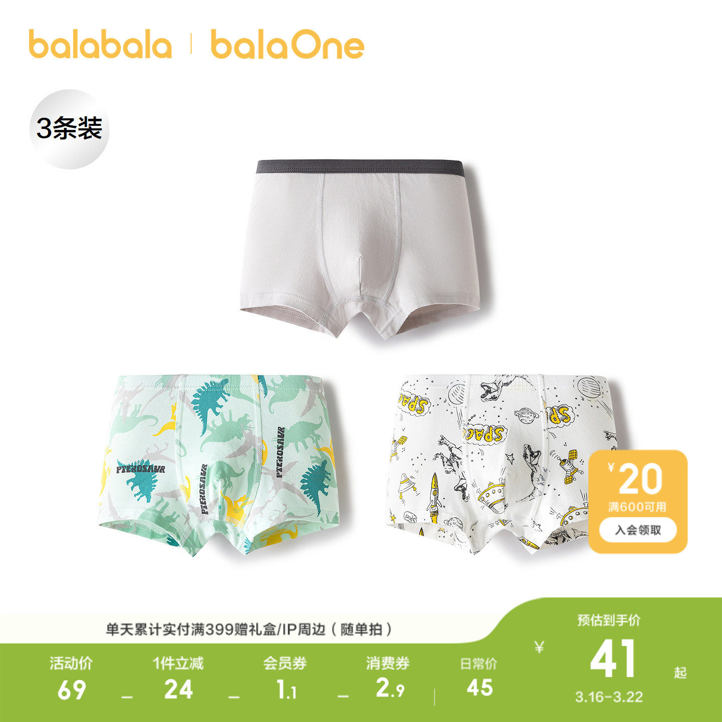 【balaOne】巴拉巴拉儿童内裤棉男童不夹pp抗菌裆四角短裤三条装