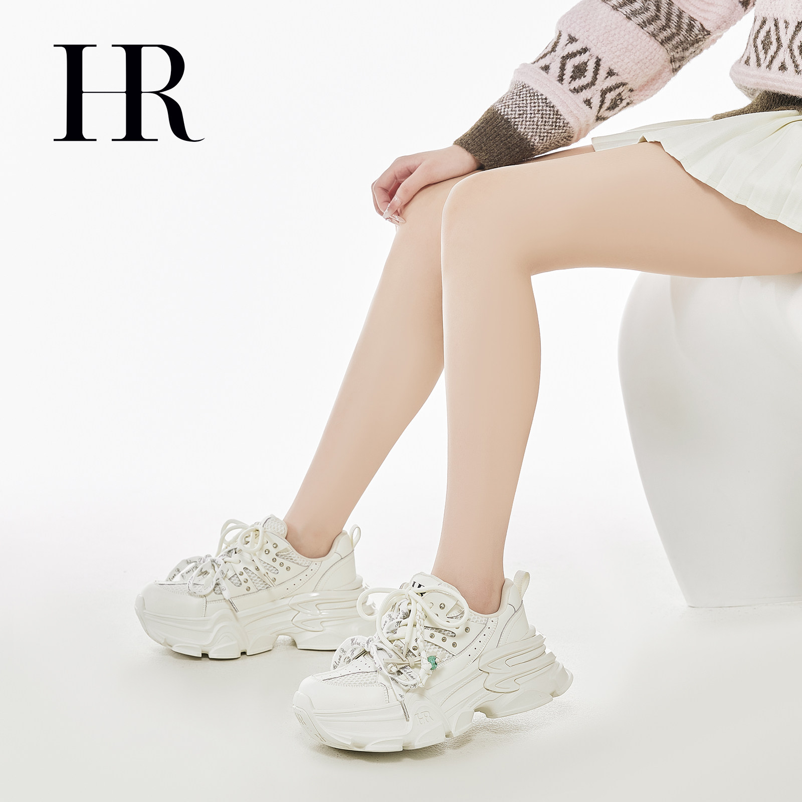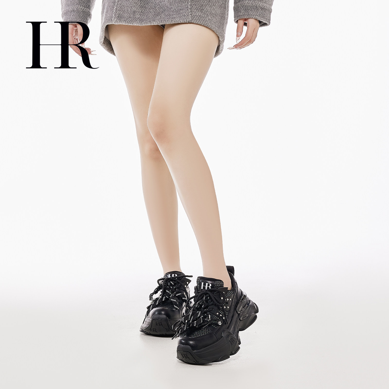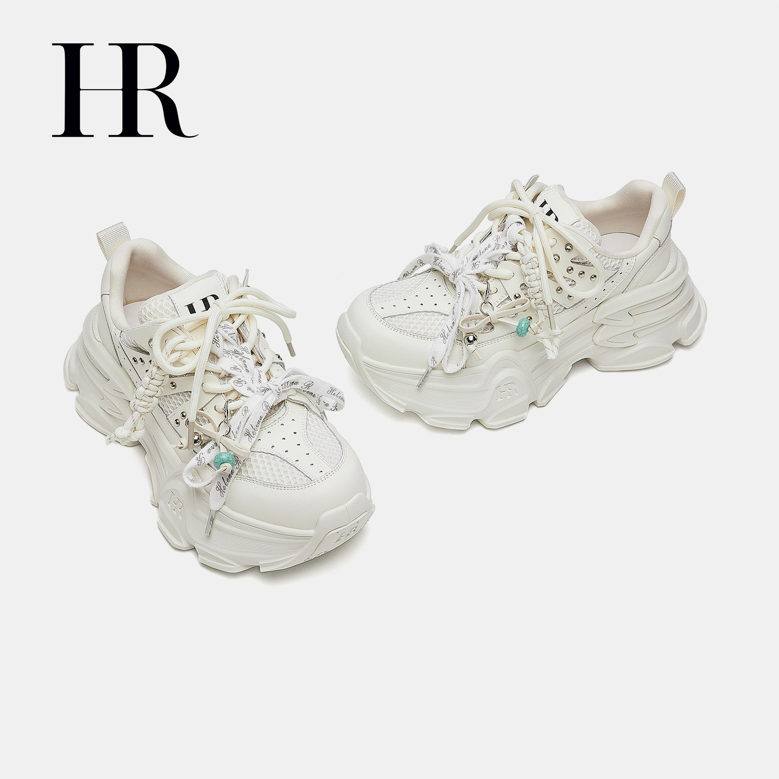 HR赫莲娜串珠绑带老爹鞋2026年春季新款女鞋子厚底增高铆钉运动鞋