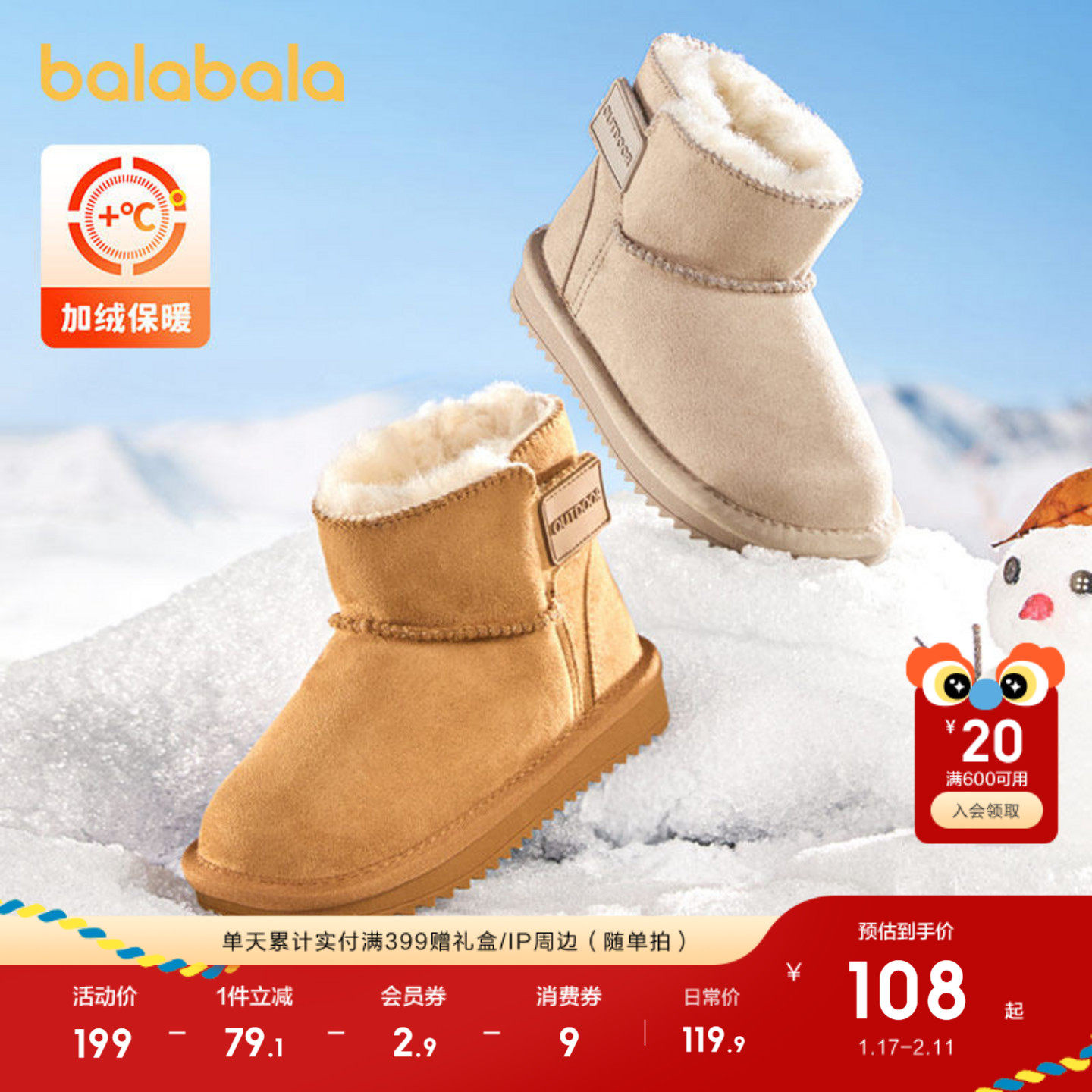 巴拉巴拉童鞋儿童雪地靴男女童短靴宝宝加绒加厚棉鞋2025新冬靴子