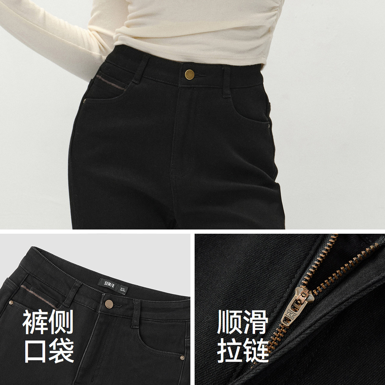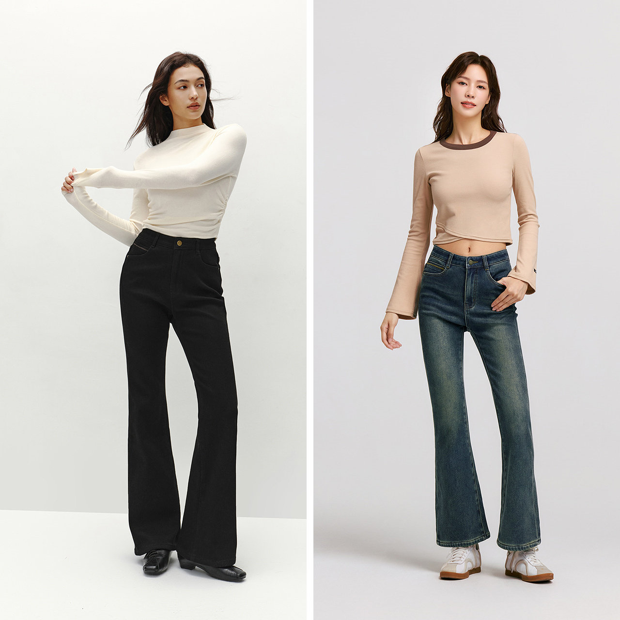森马牛仔裤女冬季加绒弹力做旧长裤女士复古港风简约显腿长喇叭裤