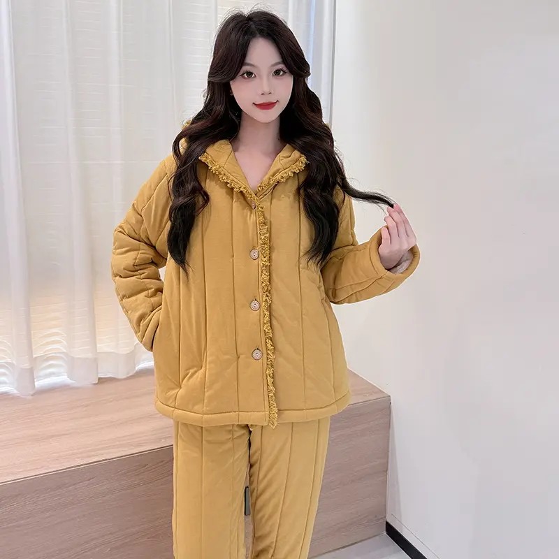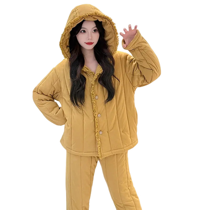 2025新款珊瑚绒睡衣女款秋冬季三层夹棉袄加厚连帽套装保暖家居服