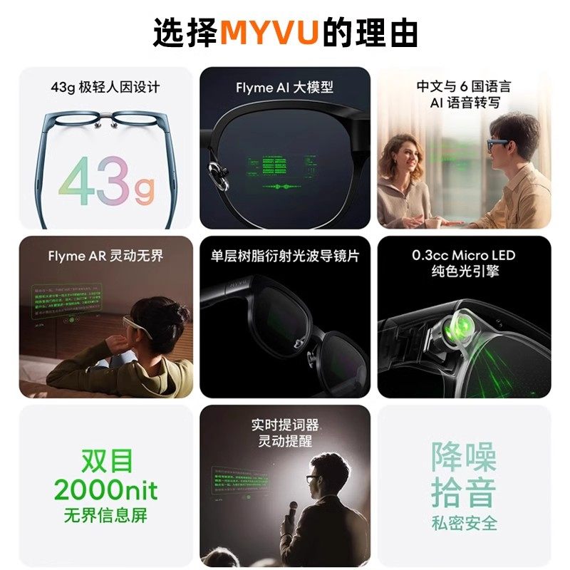 魅族StarV MYVU AI智能眼镜实时字幕同声翻译眼镜出国旅游导航演讲提词器会议无线翻译ai眼镜