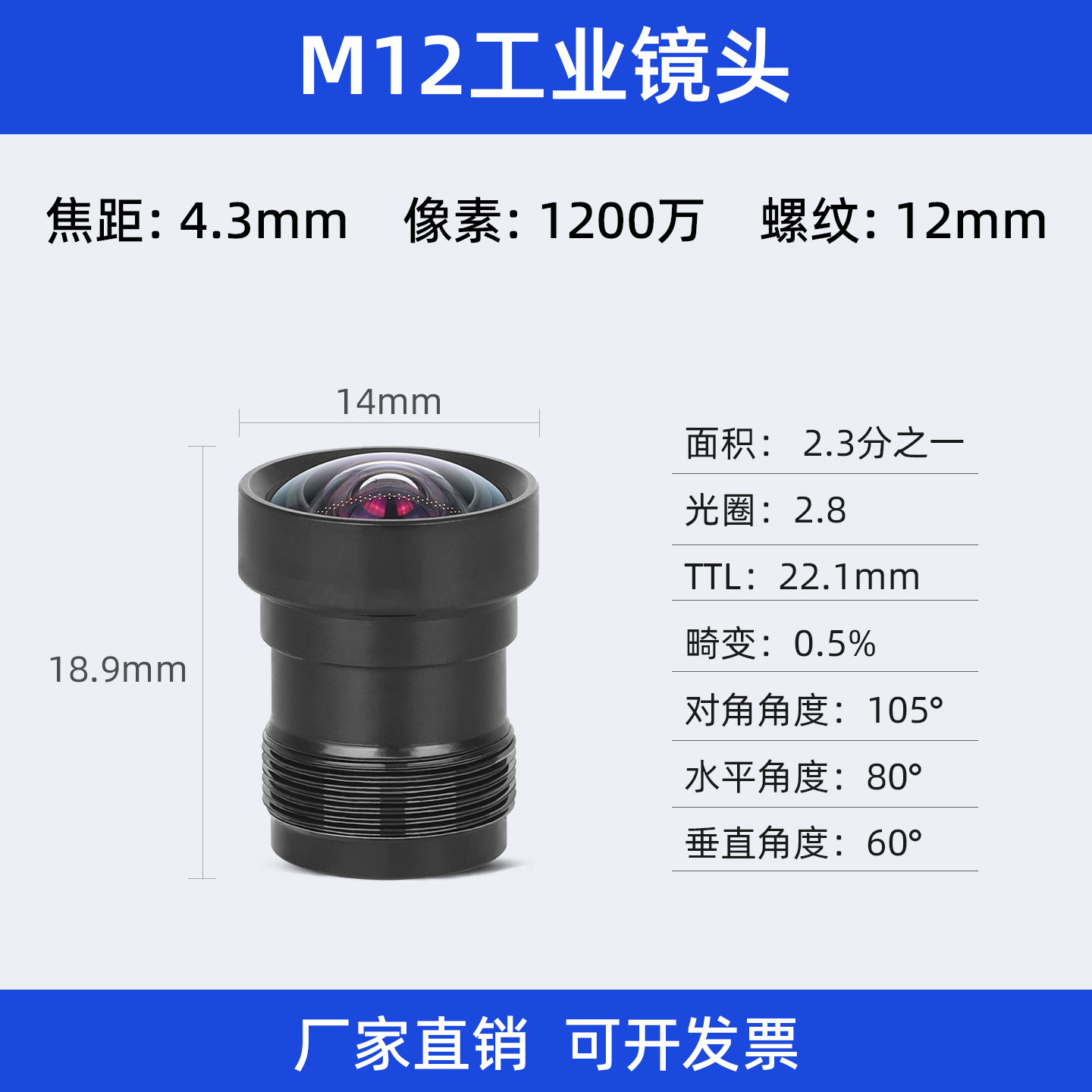 无畸变M12镜头2.3分之一1200万像素高清红外工业摄像广角不变形