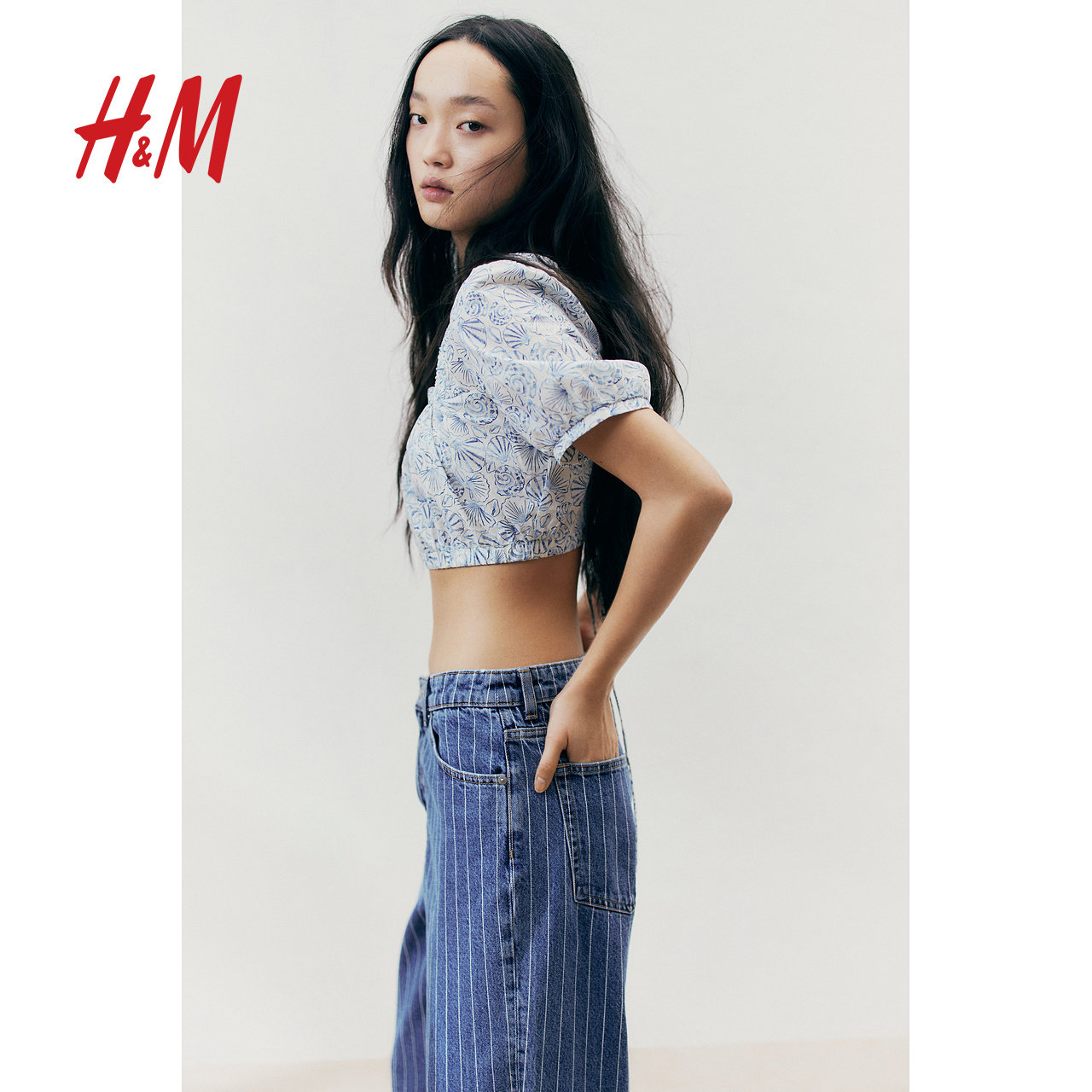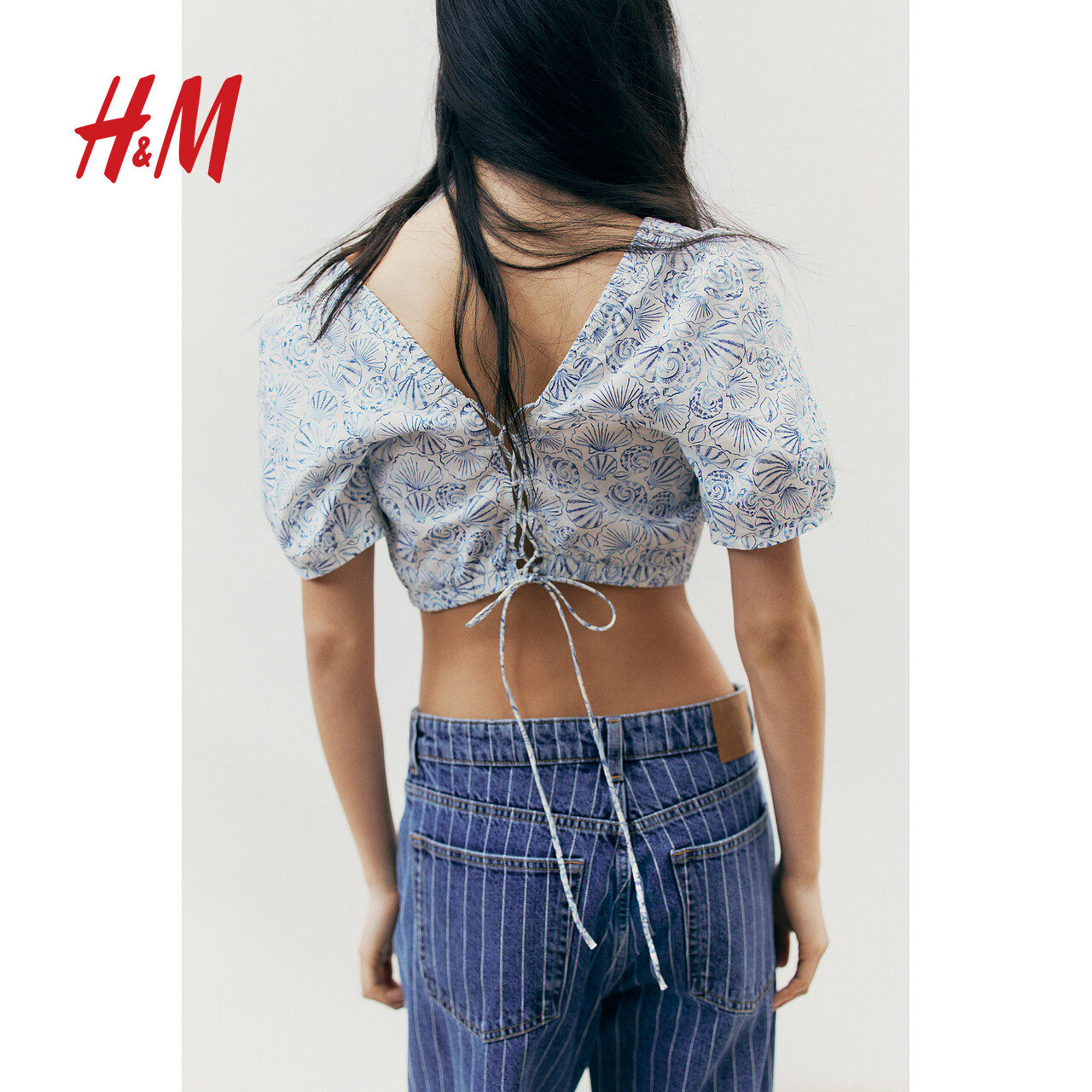 HM女装衬衫春夏时尚度假风方领绑带设计短袖短款截短衬衫1282790
