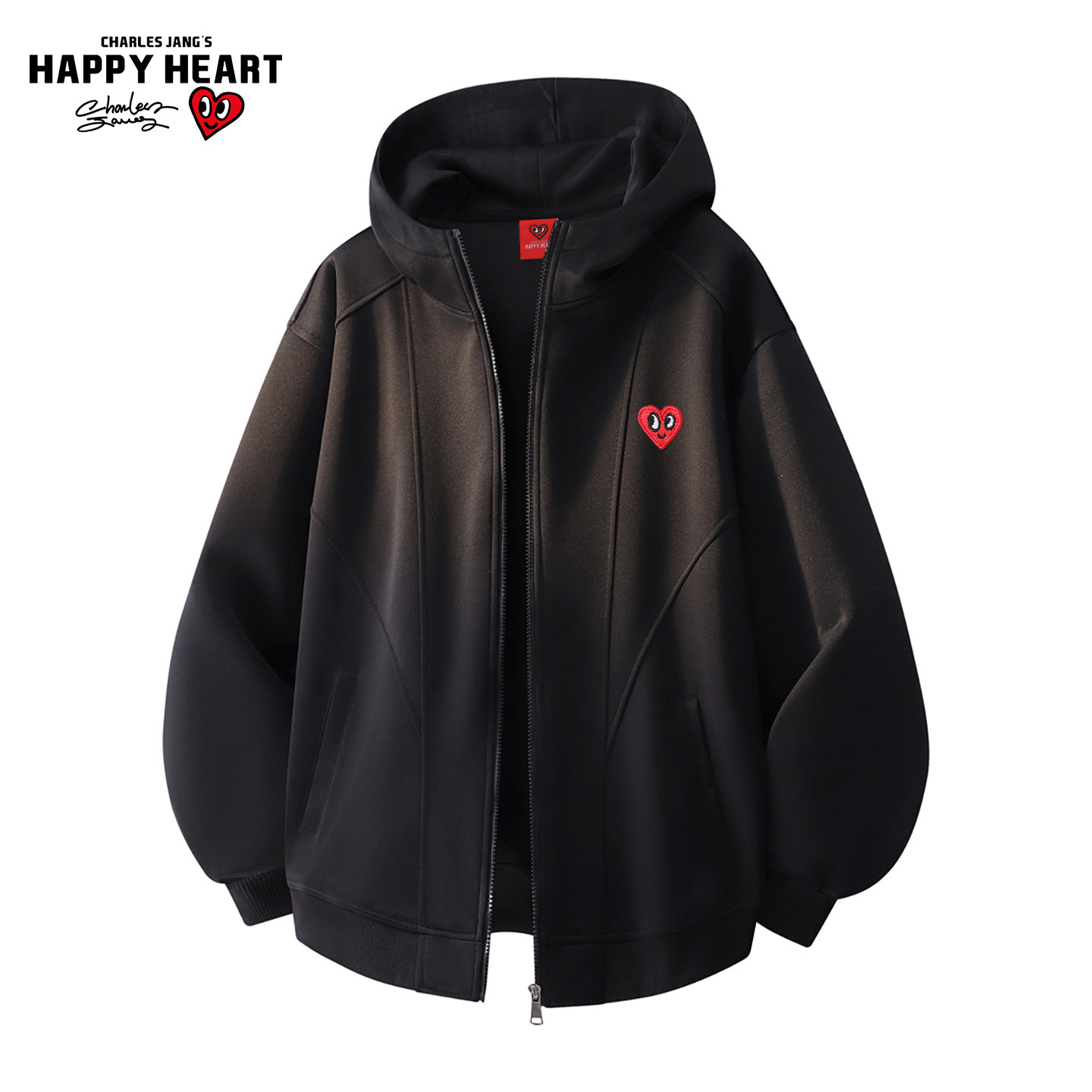查尔斯桃心美式连帽开衫卫衣男冬季加绒保暖爱心刺绣解构情侣外套