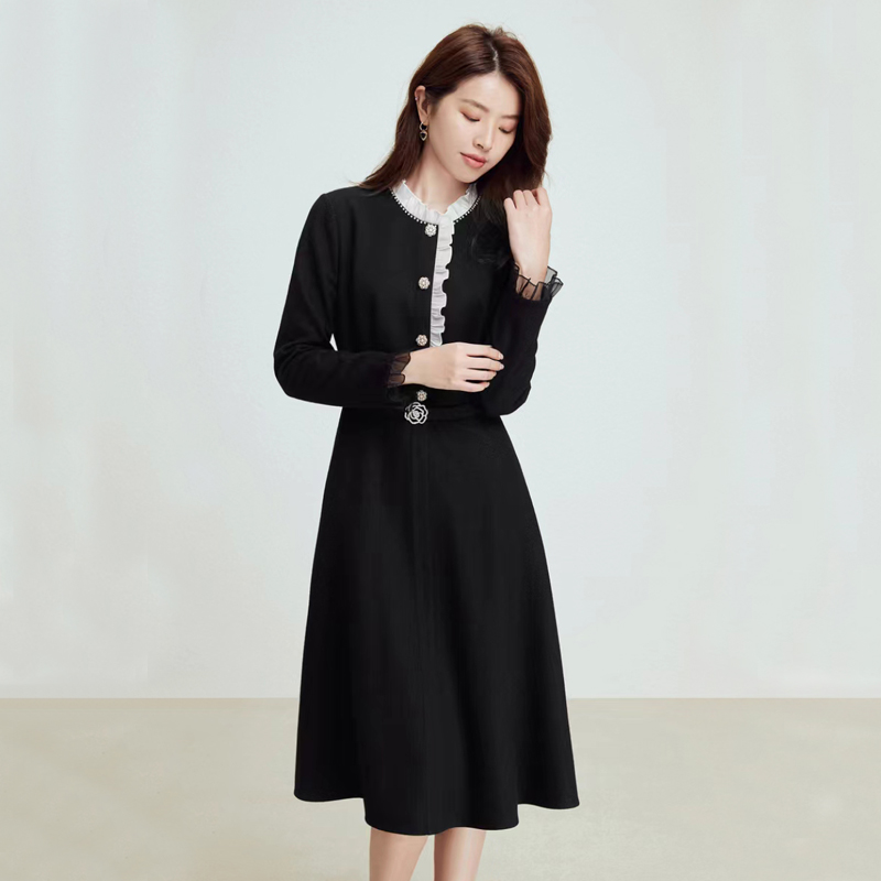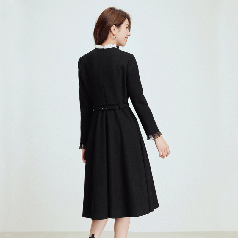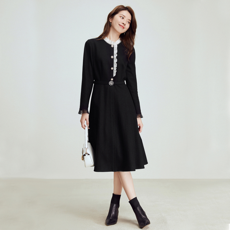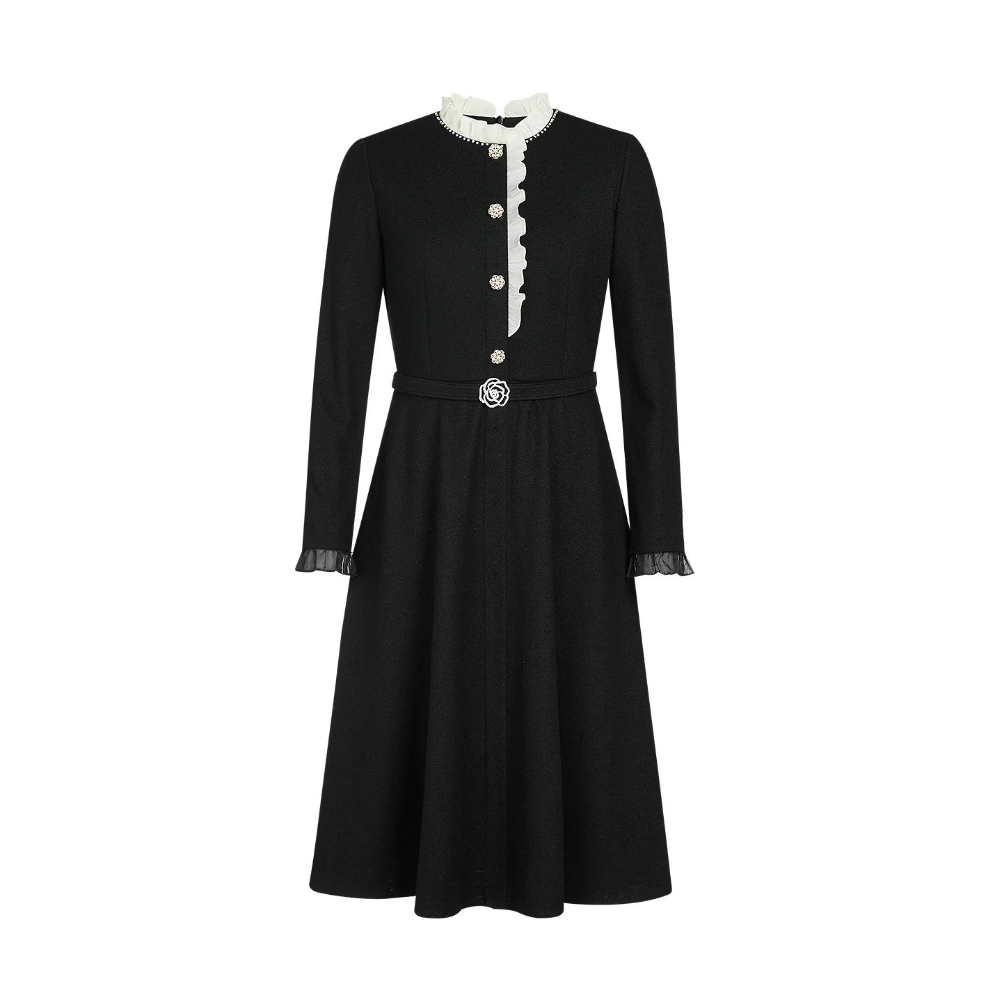 珂莱商场同款2025秋冬季新款女装黑色气质收腰中长款羊毛呢连衣裙