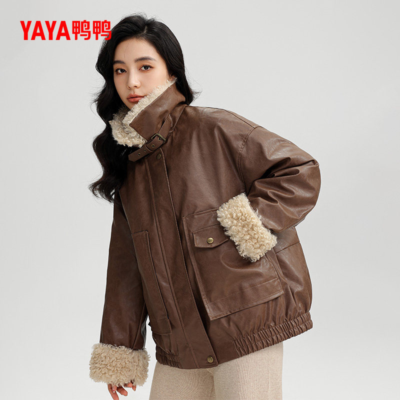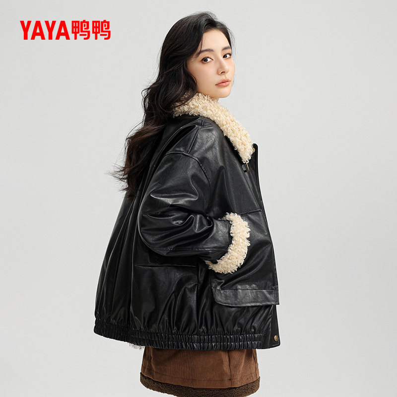 鸭鸭羽绒服女士2025秋冬反季短款拼接毛领时尚休闲鸭绒夹克外套J