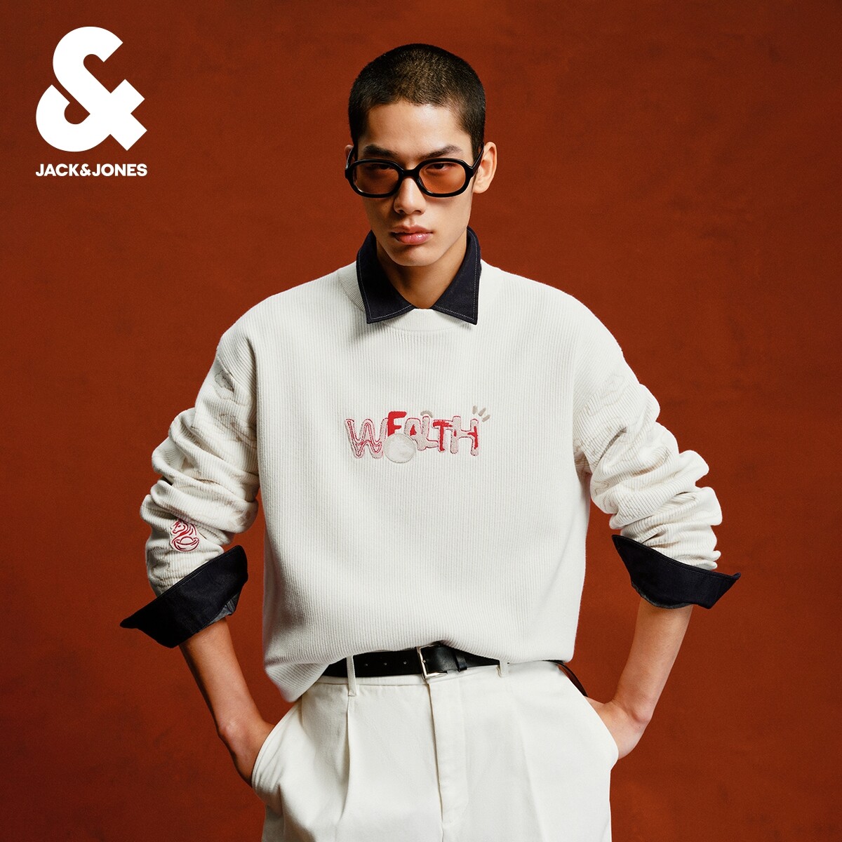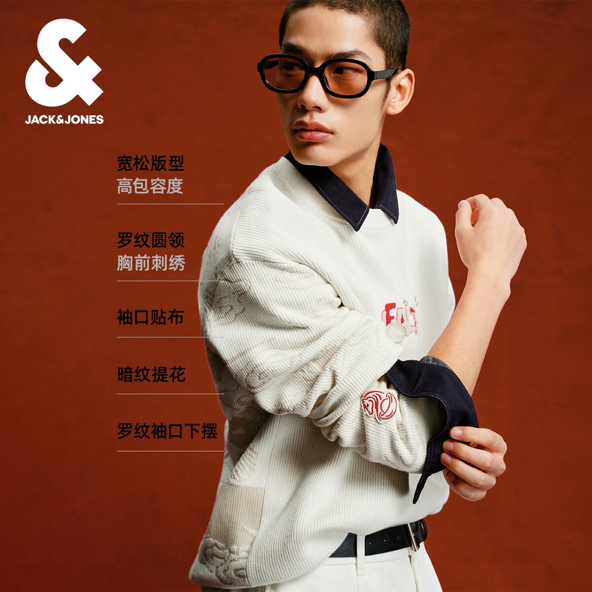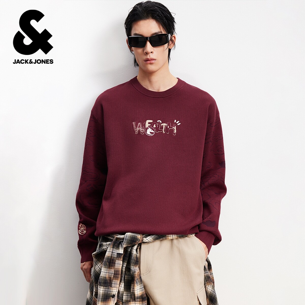 [肌理面料]杰克琼斯男装红色肌理礼物毛衣刺绣宽松本命年针织衫