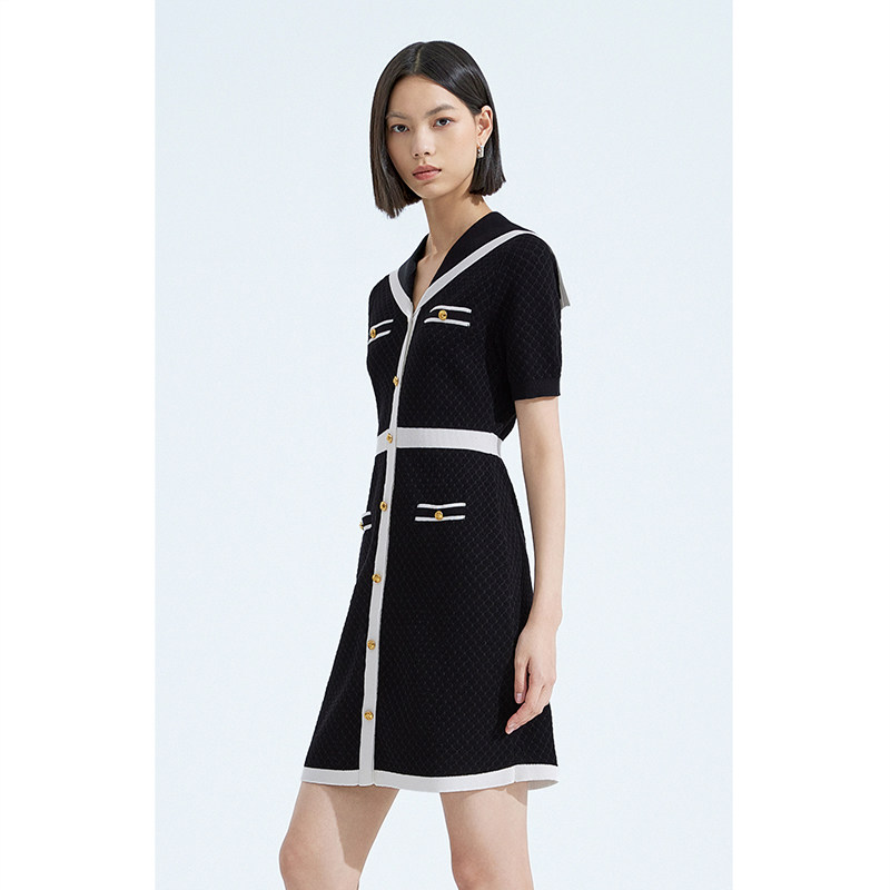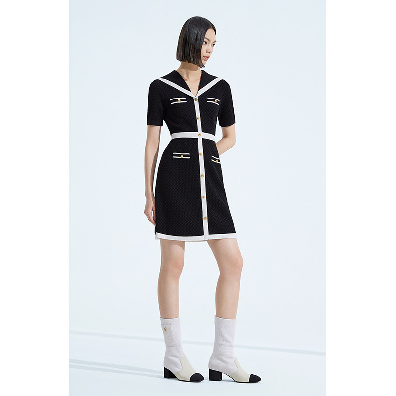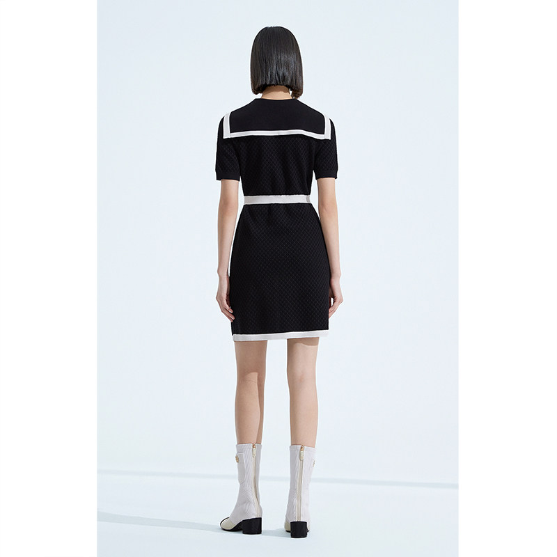 ochirly欧时力 珠片纱小香风针织连衣裙夏装海军领撞色