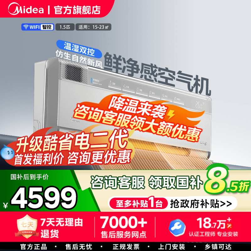 美的1.5匹一级空调挂机无风感冷暖新风