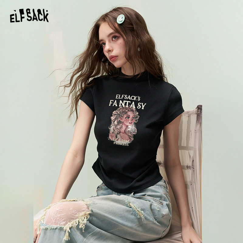 妖精的口袋白色半高领收腰印花短袖t恤女2026年早春新款修身上衣