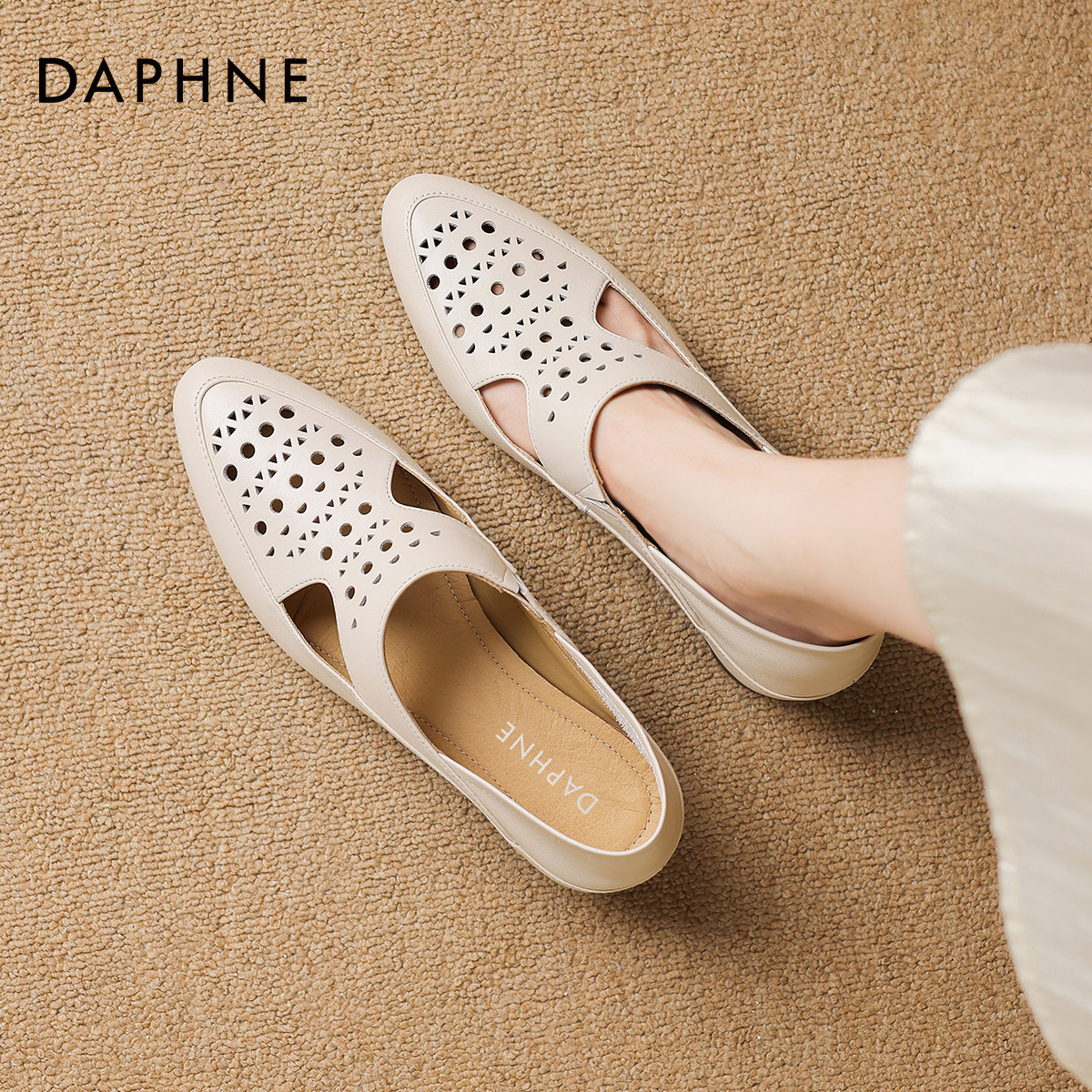 达芙妮镂空凉鞋女款2026新款夏季气质尖头单鞋软底低跟女士皮鞋