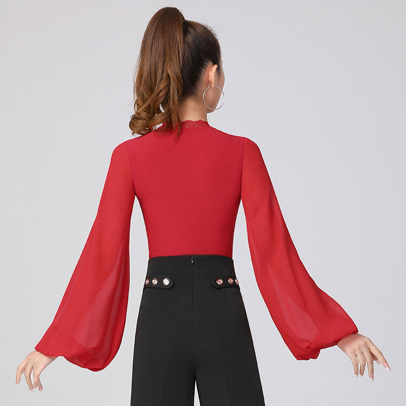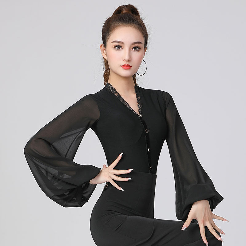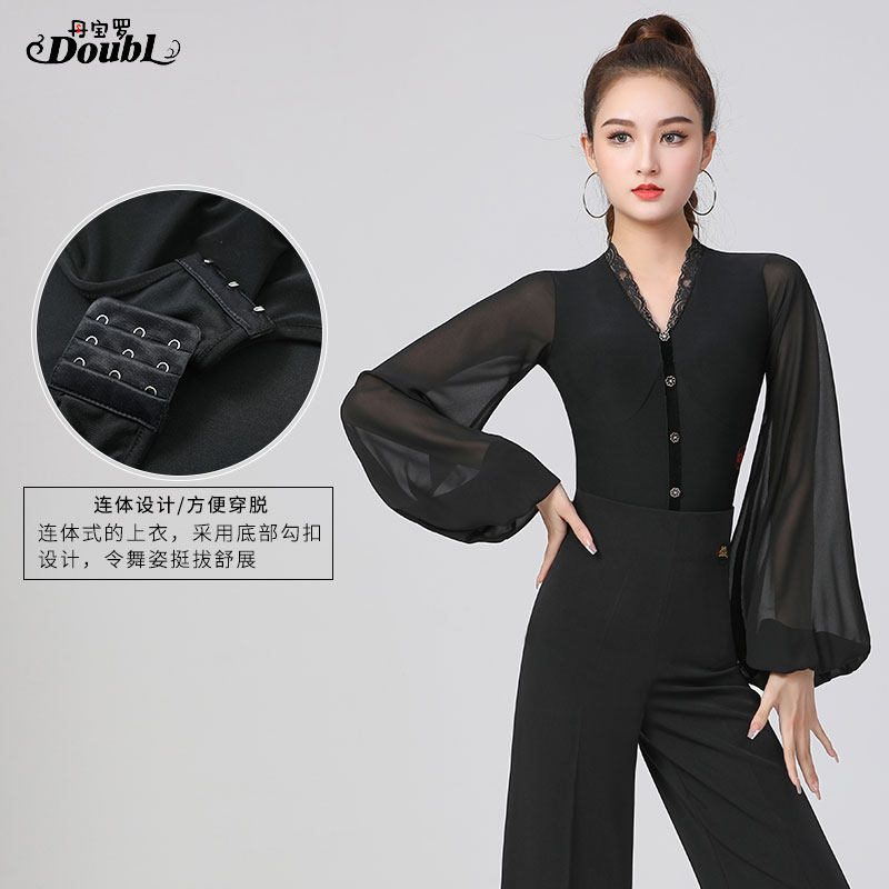 丹宝罗摩登舞上衣女V领灯笼袖连体国标衣服高级华尔兹舞蹈服舞衣