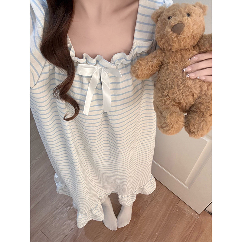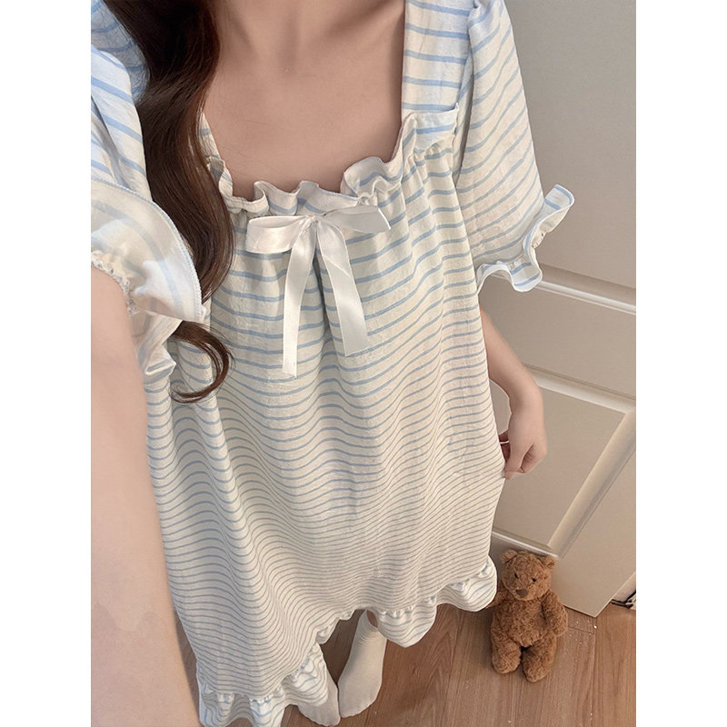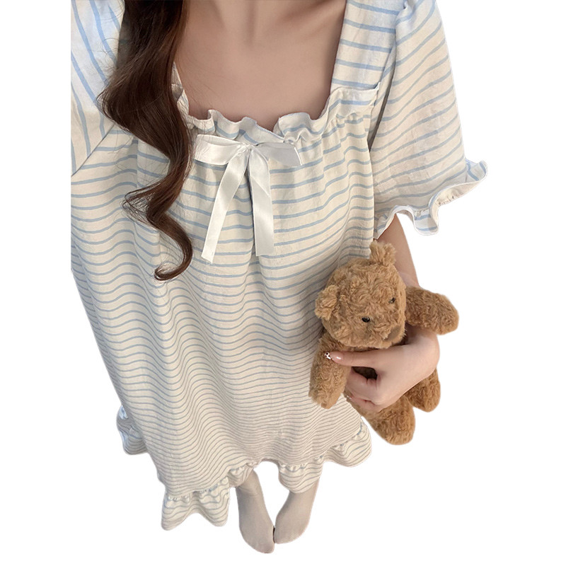 带胸垫睡裙女款夏季棉绸短袖条纹睡衣2026新款女士宽松甜美家居服