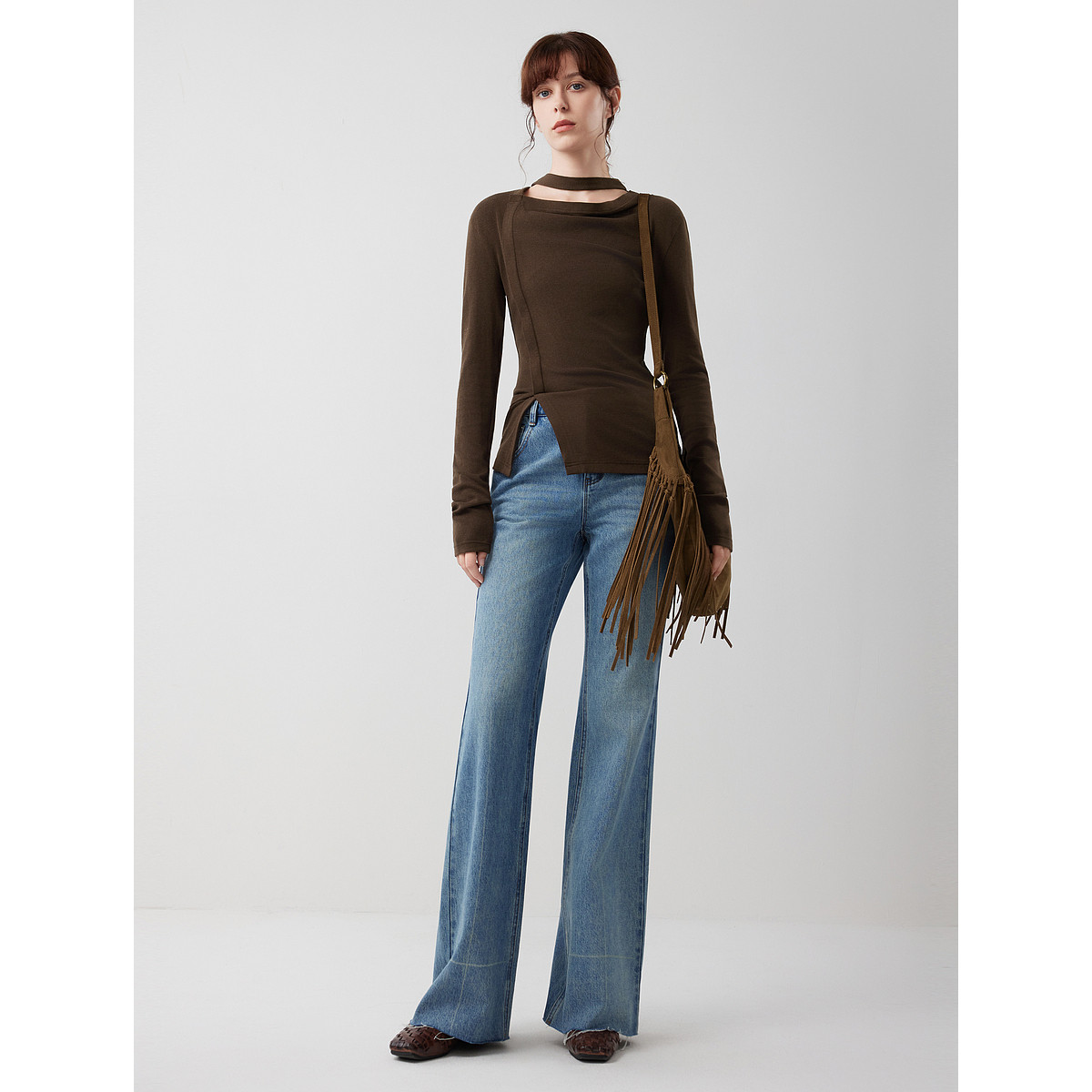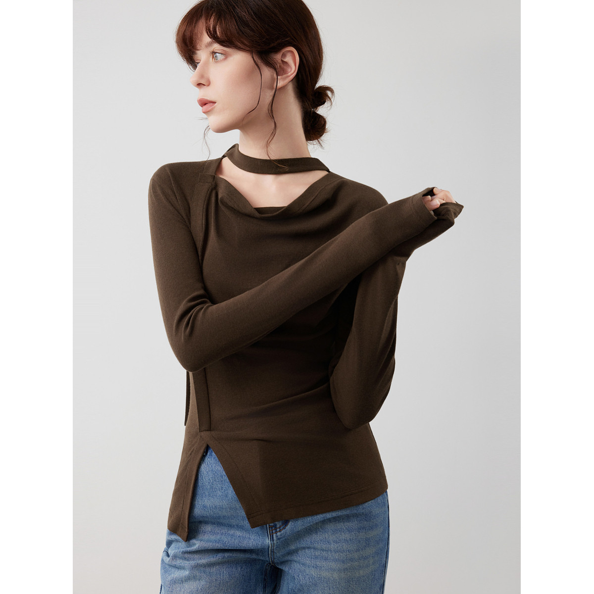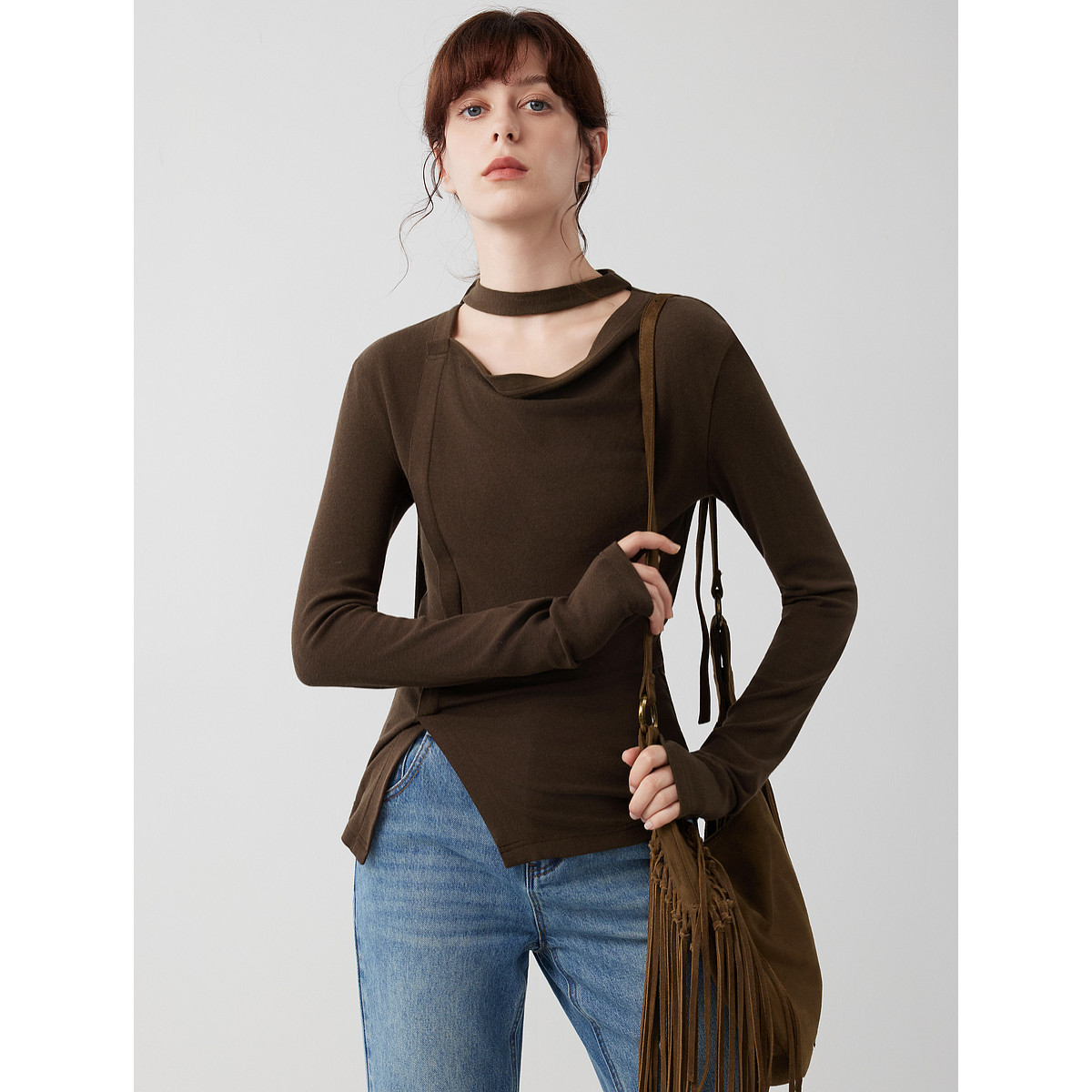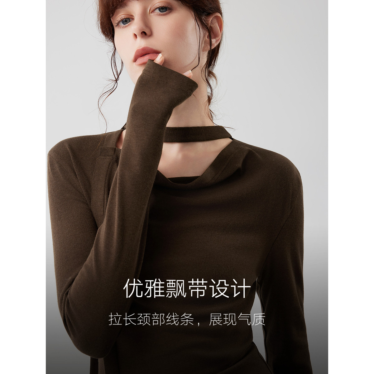 ELLE咖啡色复古磨毛长袖T恤女2025冬季新款飘带领设计感打底上衣