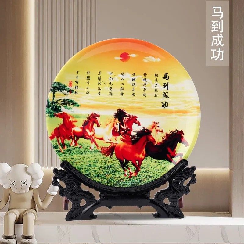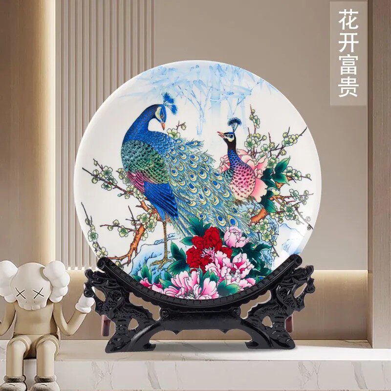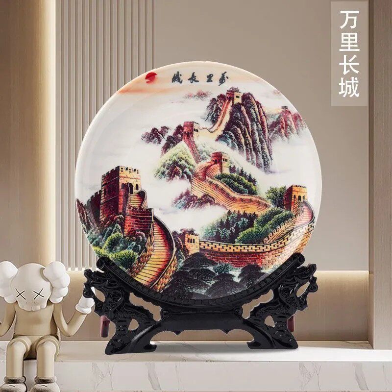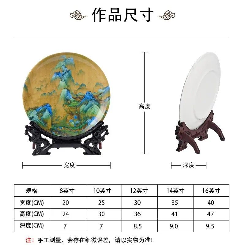 陶瓷装饰挂盘千里江山图送底座客厅酒柜玄关书房工艺摆件馈赠礼品