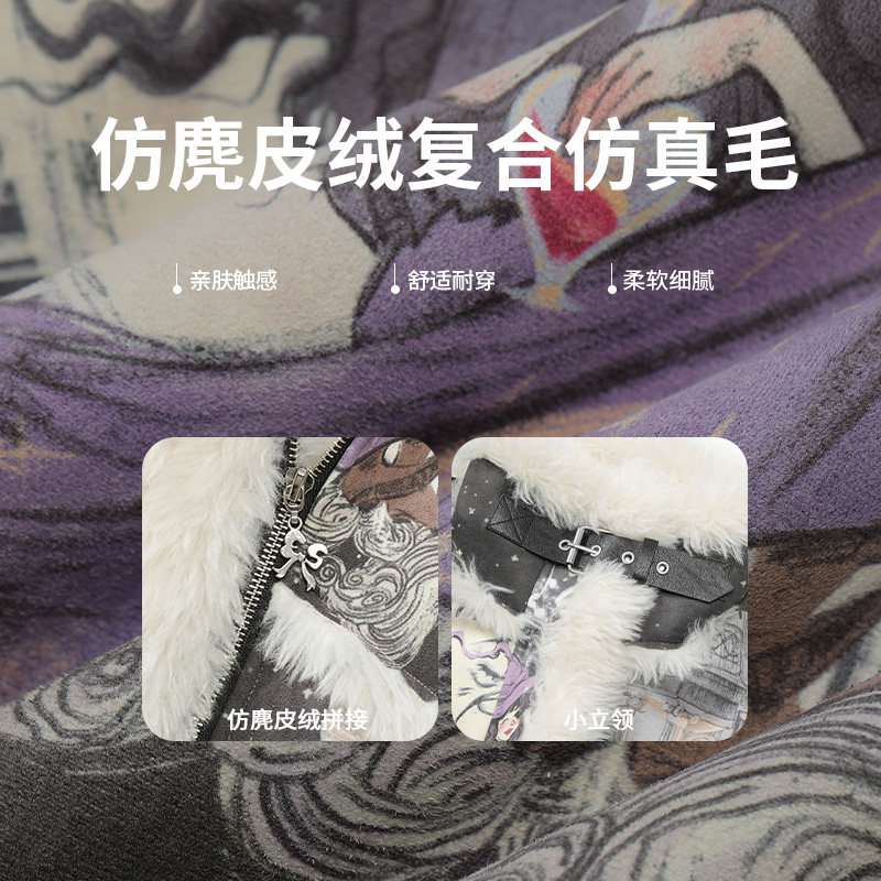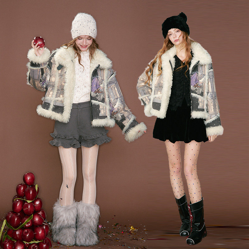 妖精的口袋皮毛一体满印短款毛呢外套女2025冬新款千金感过年战袍