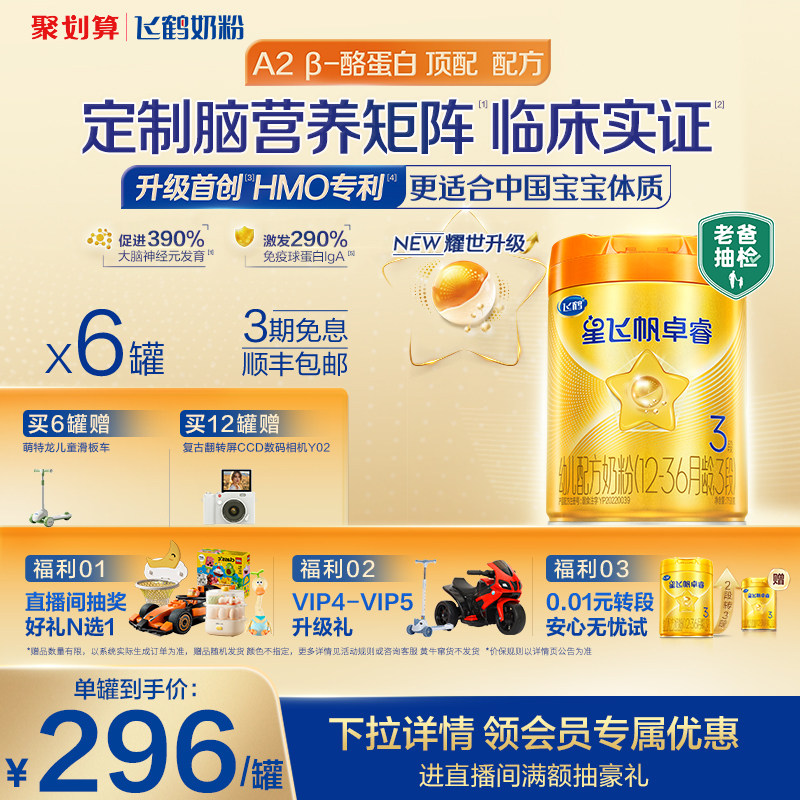 【官方正品】飞鹤卓睿ProA2β酪蛋白3段婴儿奶粉758g*6罐HMO升级