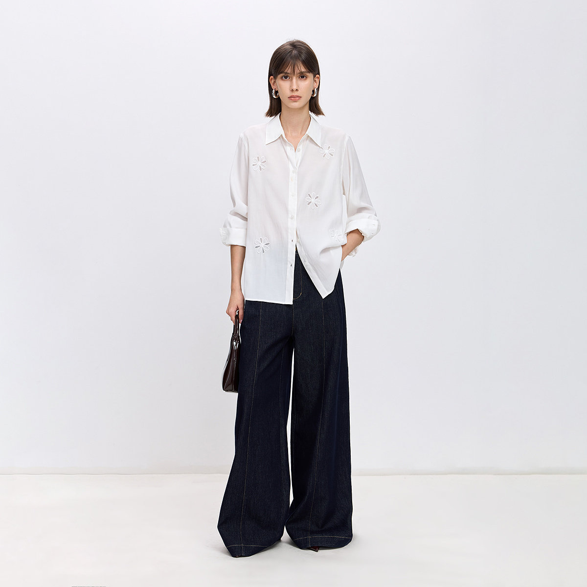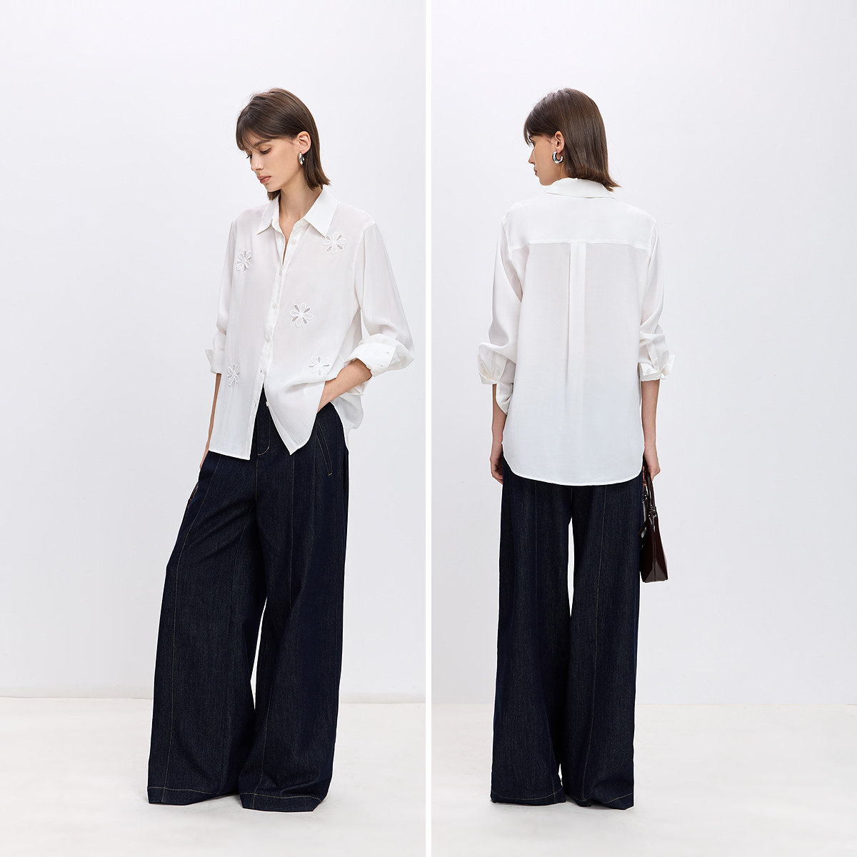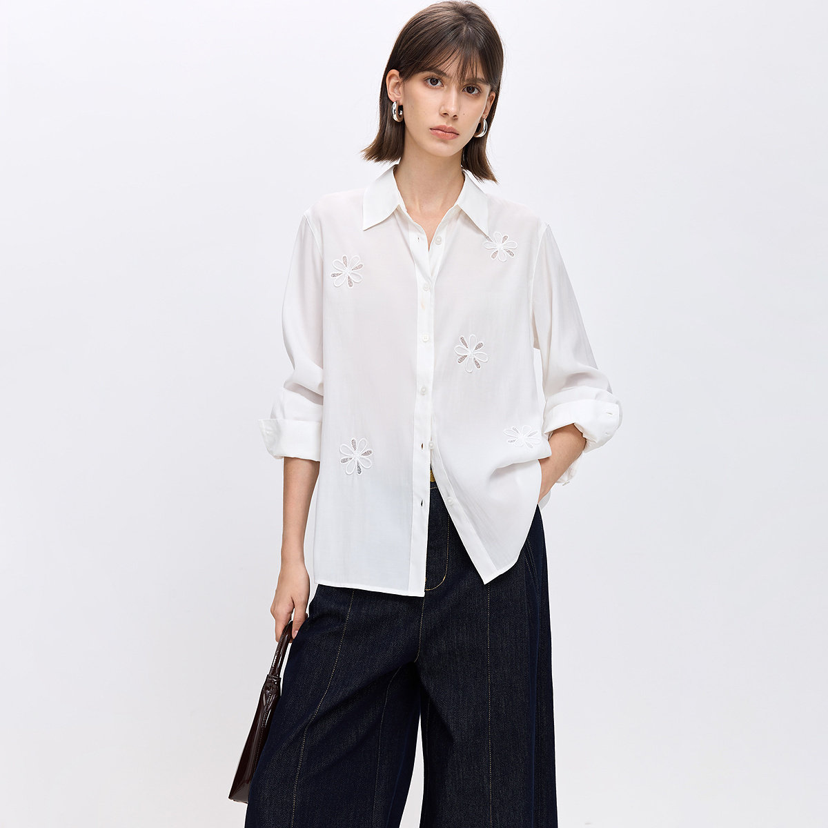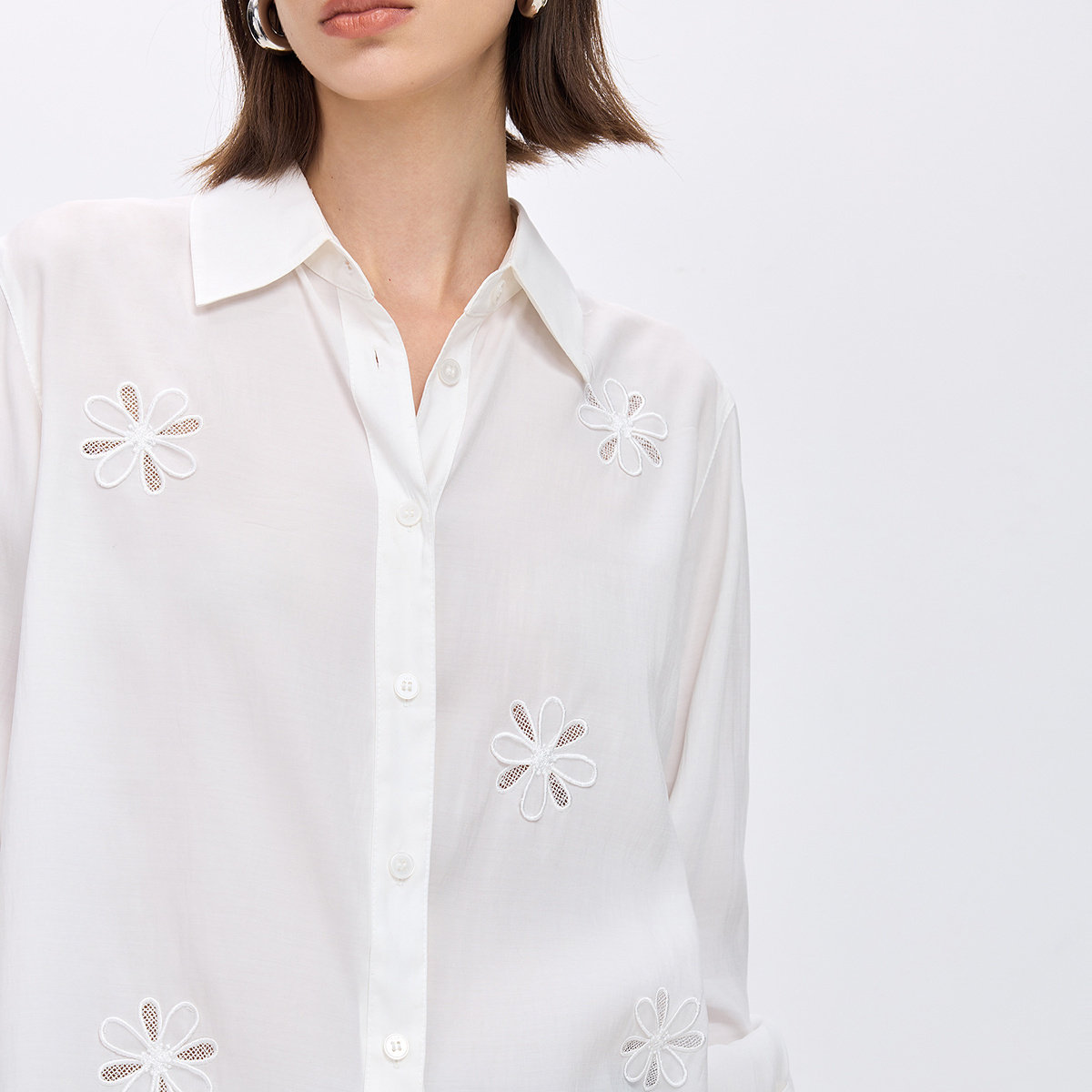 LILY2026春新款衬衣莫代尔镂空刺绣高级气质上衣米白色长袖衬衫女