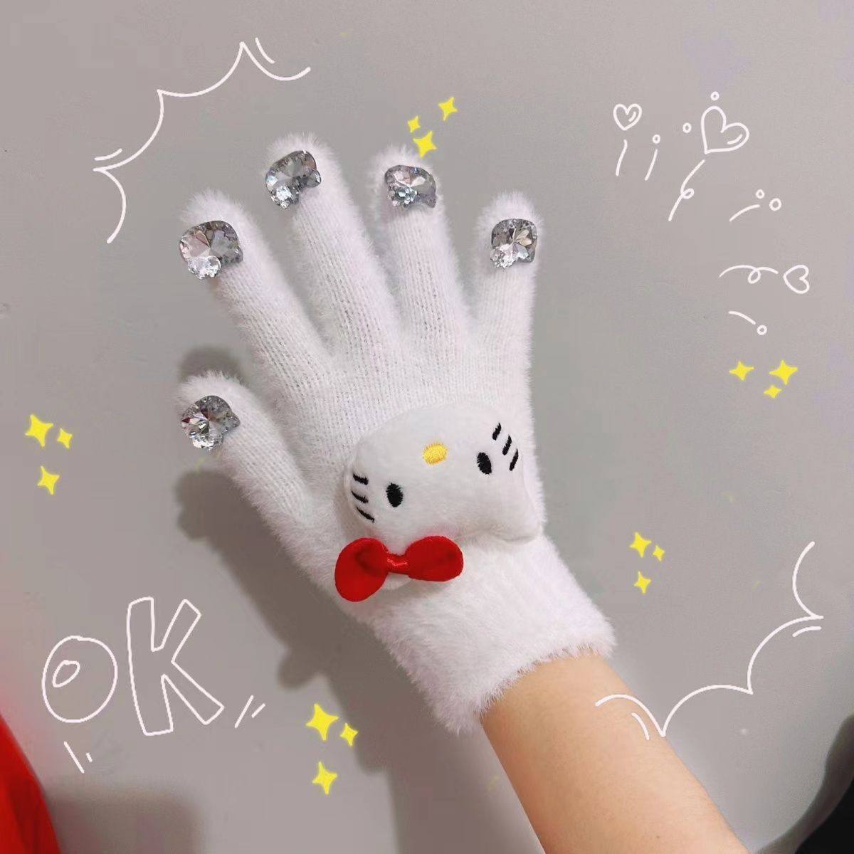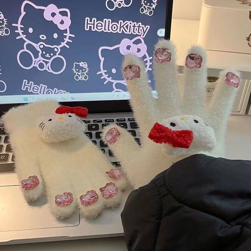 滑雪手套女冬季加厚绒哈喽kitty骑行开车保暖棉手套防风寒可触屏