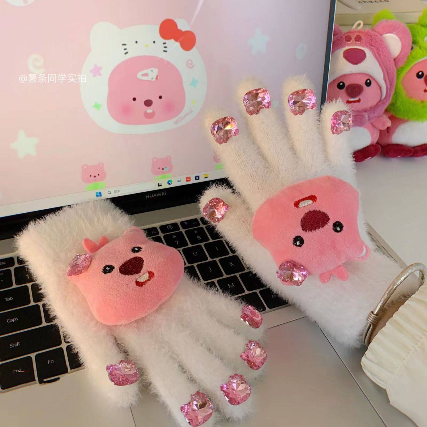 秋冬季新款loopy小海狸分指手套女卡通可爱甜美保暖加绒毛绒手套