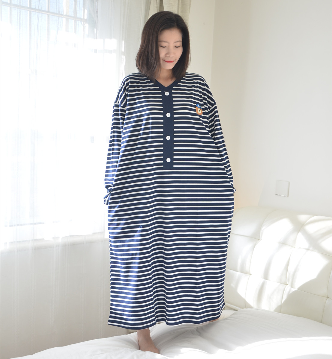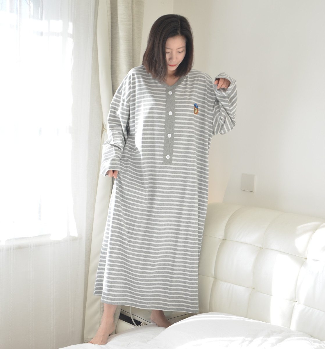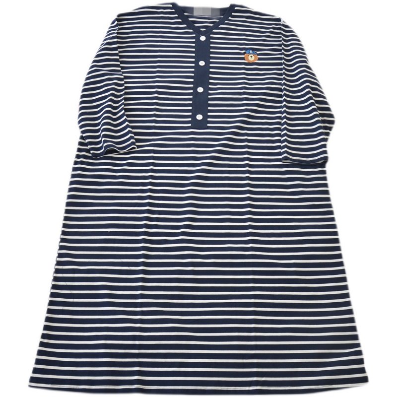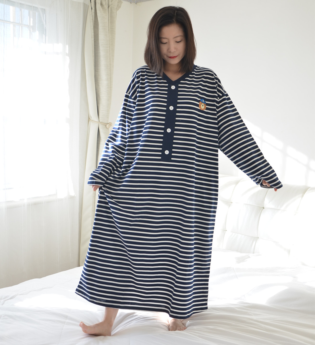 卡通小熊条纹V领睡裙女春秋长袖针织纯棉加长款加肥大码胖MM睡衣