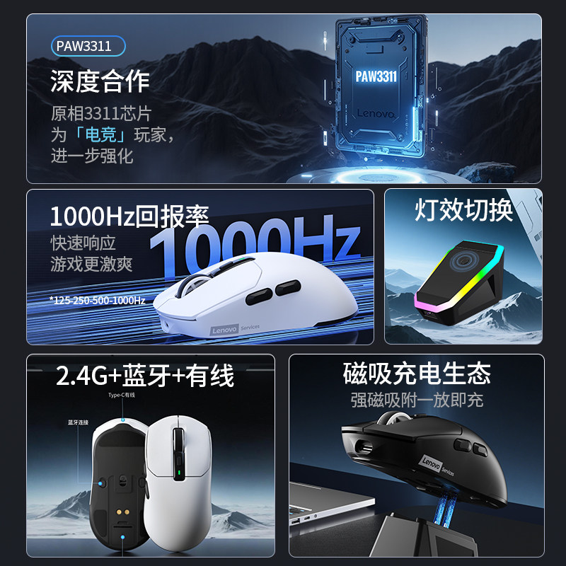 Lenovo联想百应无线蓝牙三模游戏鼠标原相3311电竞磁吸充电M322