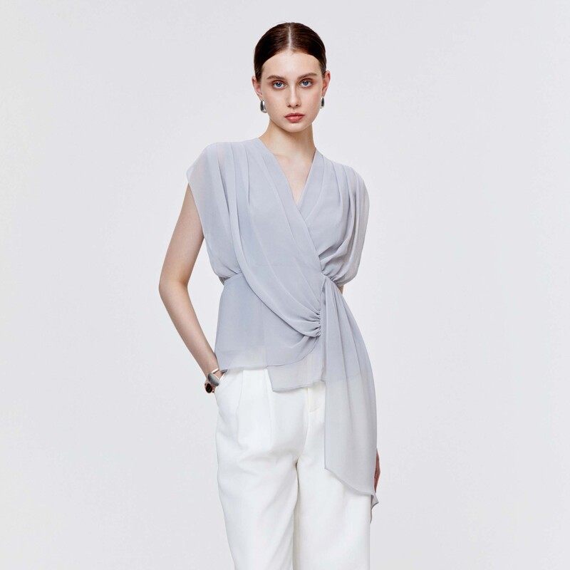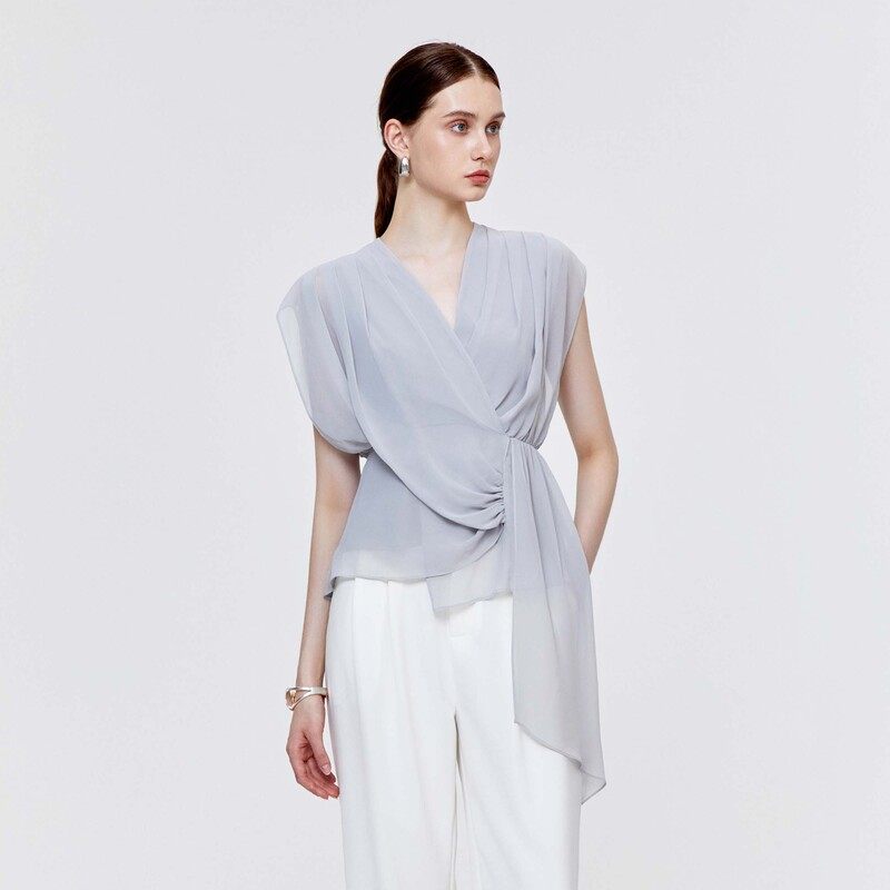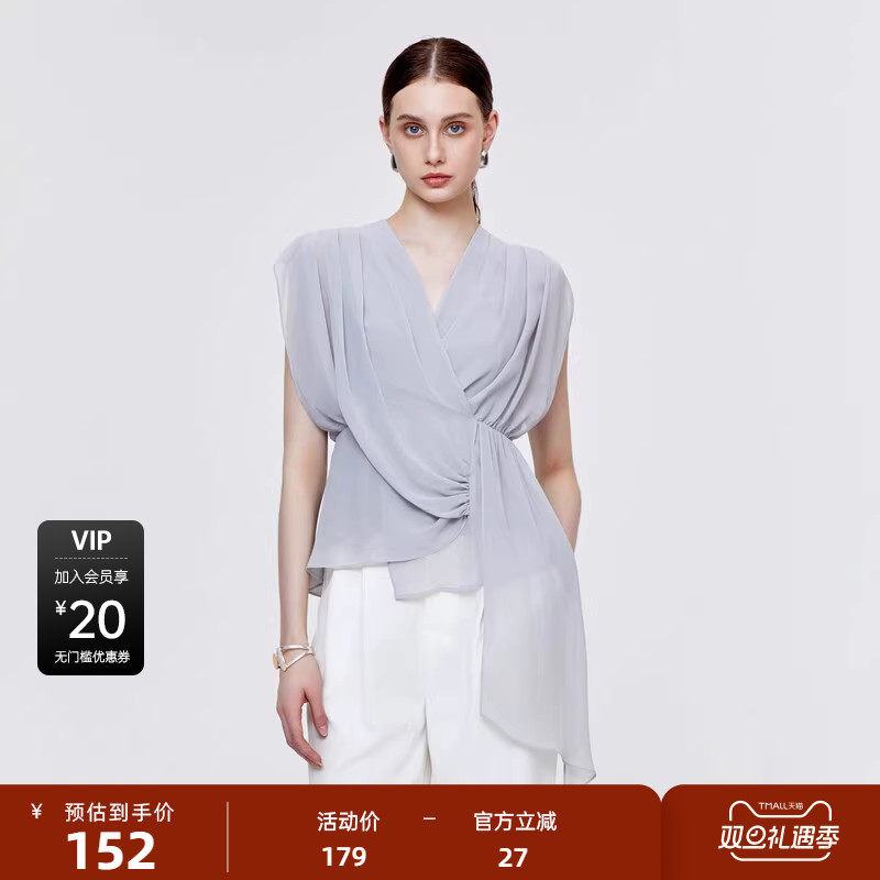 sdeer圣迪奥女装V领系带不规则拼接无袖衬衫S223Z0604