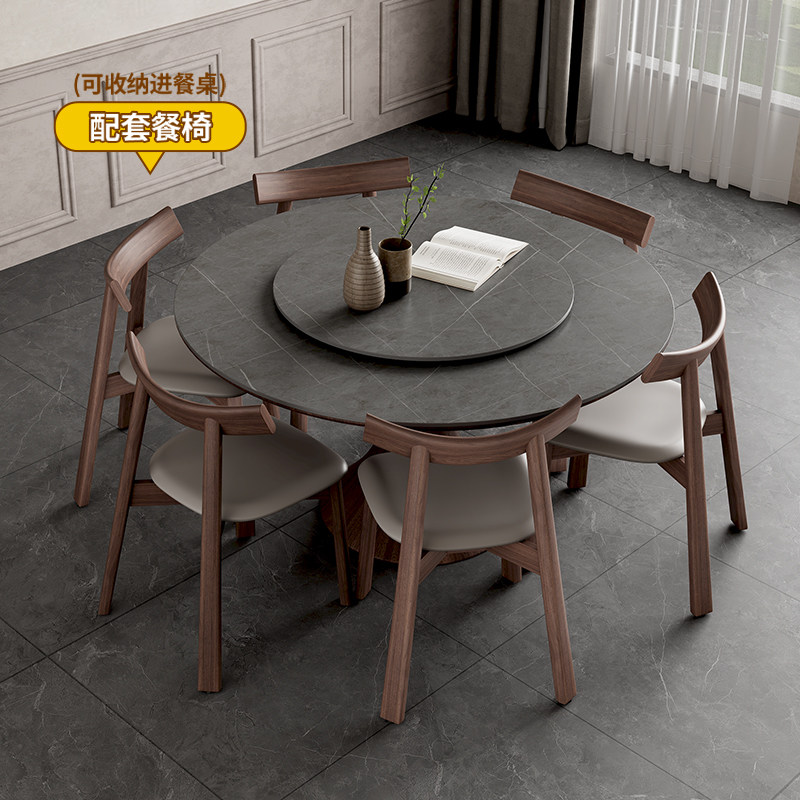 北欧实木餐桌圆形转盘现代简约胡桃色贴皮侘寂风意式哑光岩板圆桌