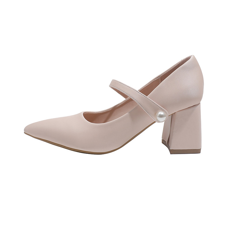 真皮~骄屿裸色尖头粗高跟鞋2026春新款法式绝美玛丽珍鞋珍珠单鞋