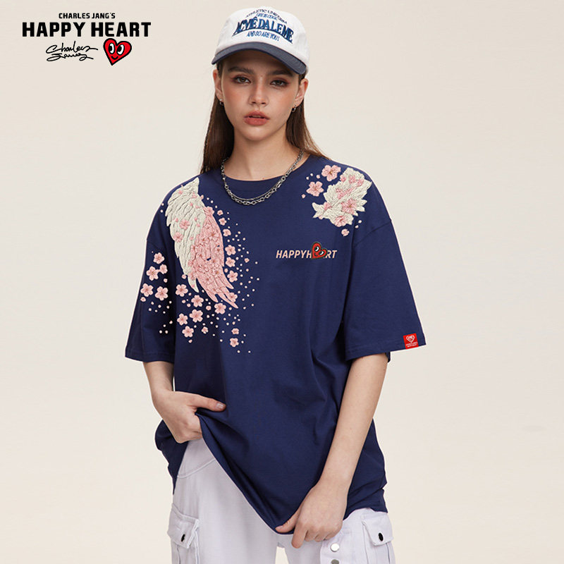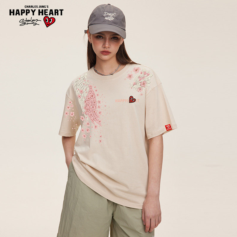 查尔斯桃心 仿刺绣翅膀印花美式高街纯棉圆领季情侣夏季短袖t恤男