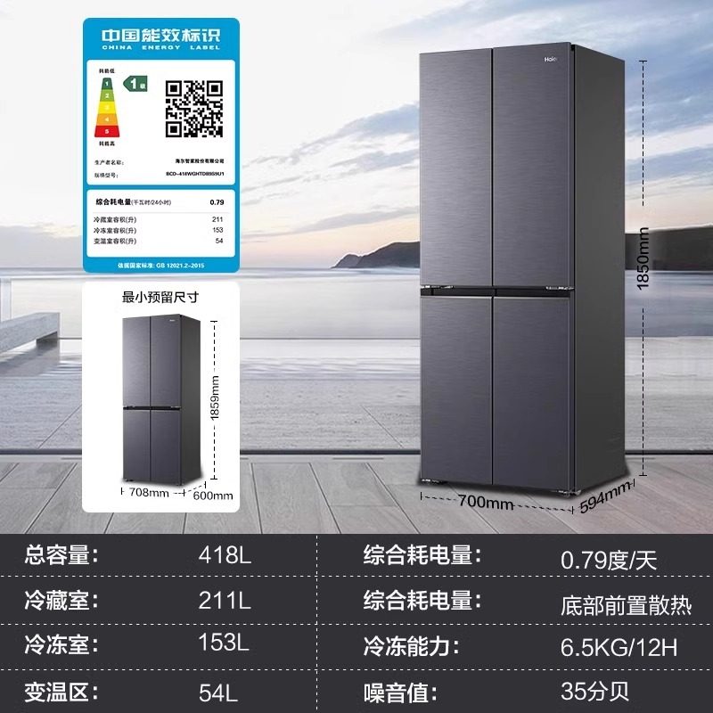 换新补贴海尔小红花418L双开四门超薄零嵌入家用风冷无霜一级冰箱