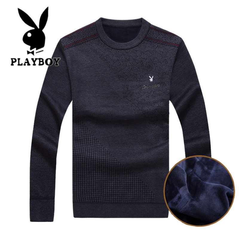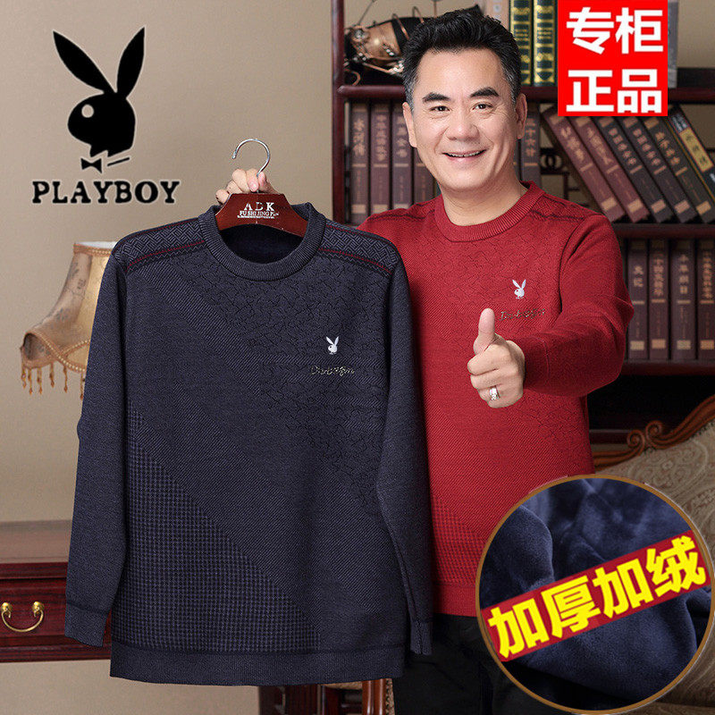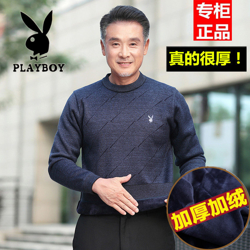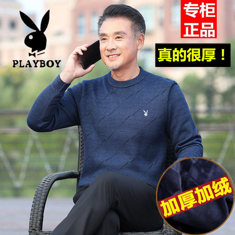 花花公子冬天中年男士加绒加厚毛衣圆领宽松老年爸爸装保暖羊毛衫