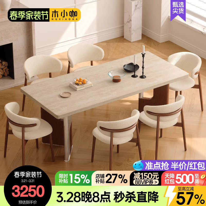 木小咖暮色餐桌包豪斯洞石岩板餐桌椅实木家用中古风长方形餐桌