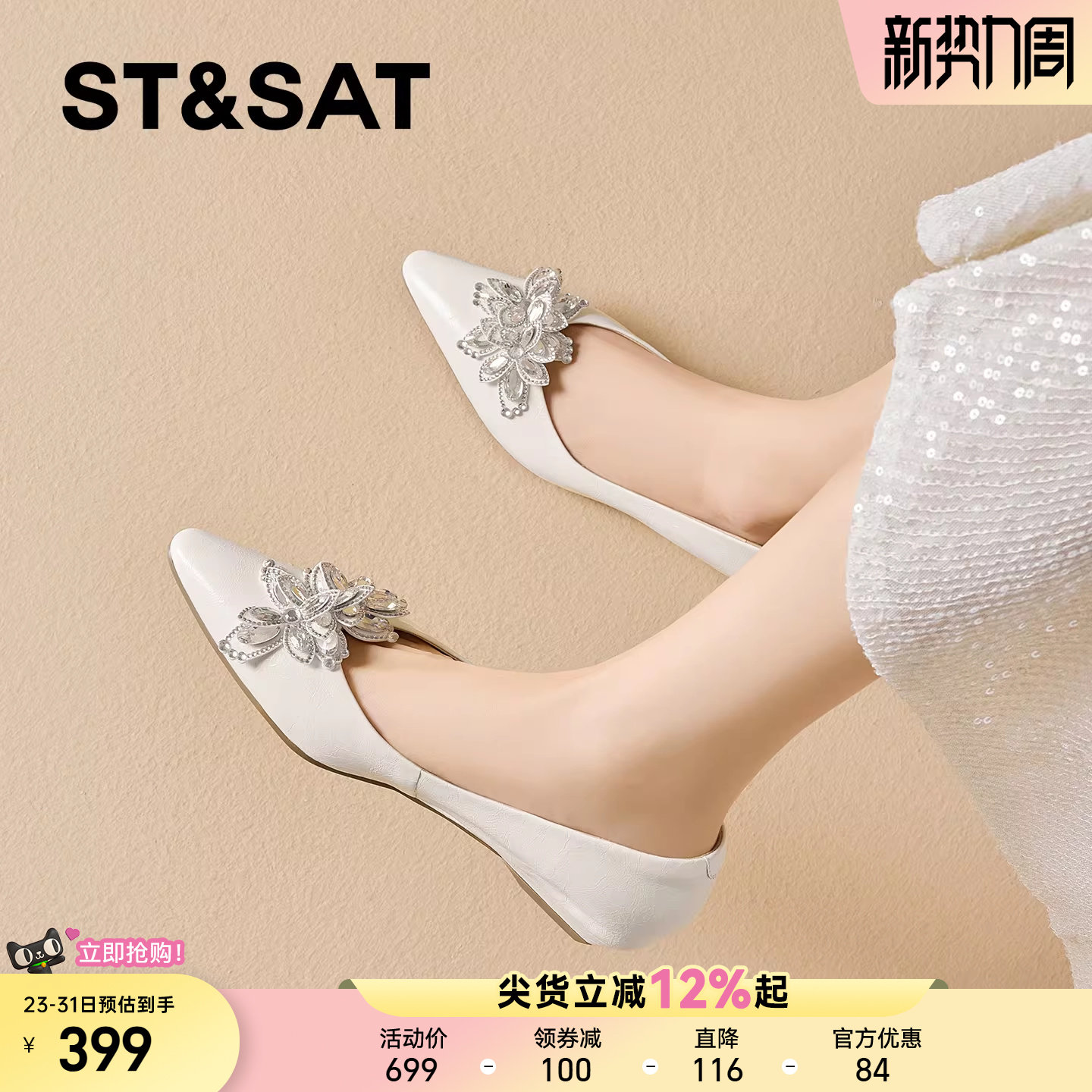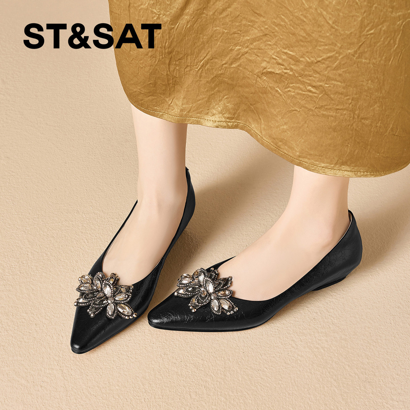 星期六真皮水钻粗跟单鞋女年春季新款尖头坡跟浅口时装鞋