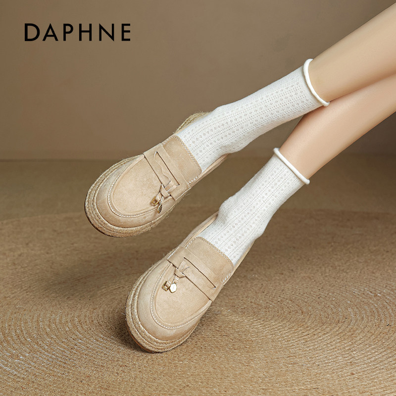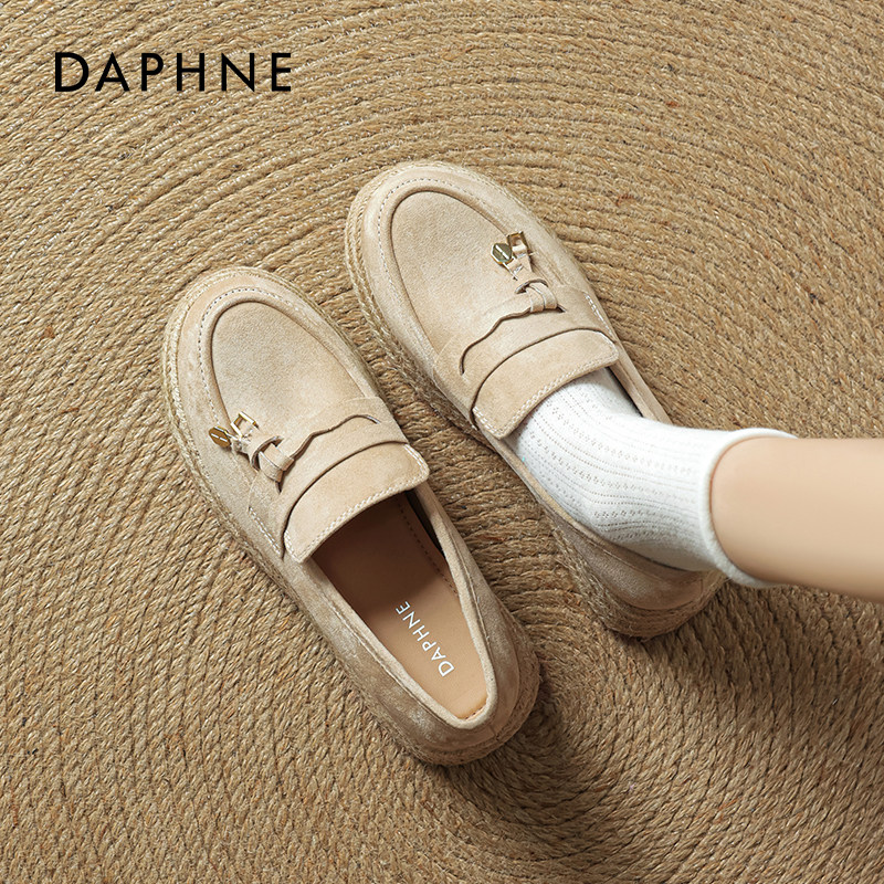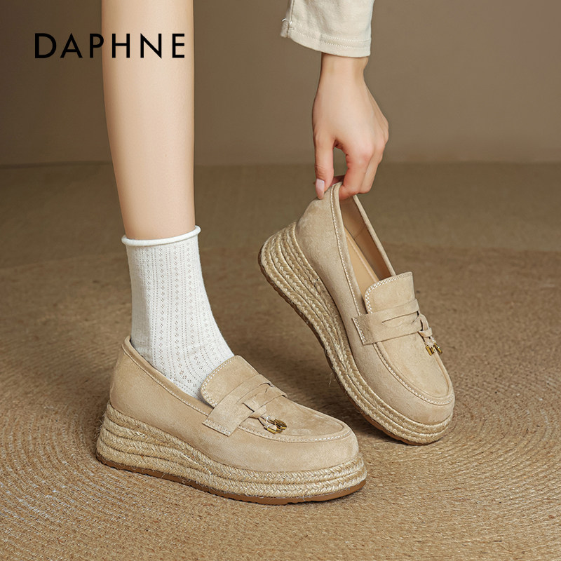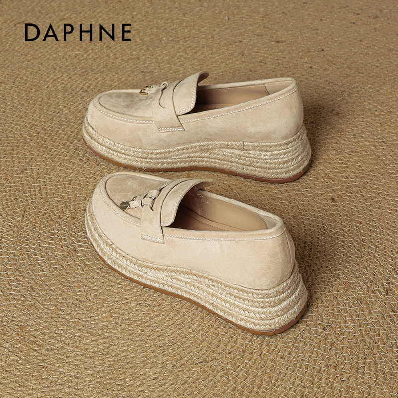 达芙妮厚底渔夫鞋女夏草编2025新款女鞋坡跟松糕增高老钱风乐福鞋