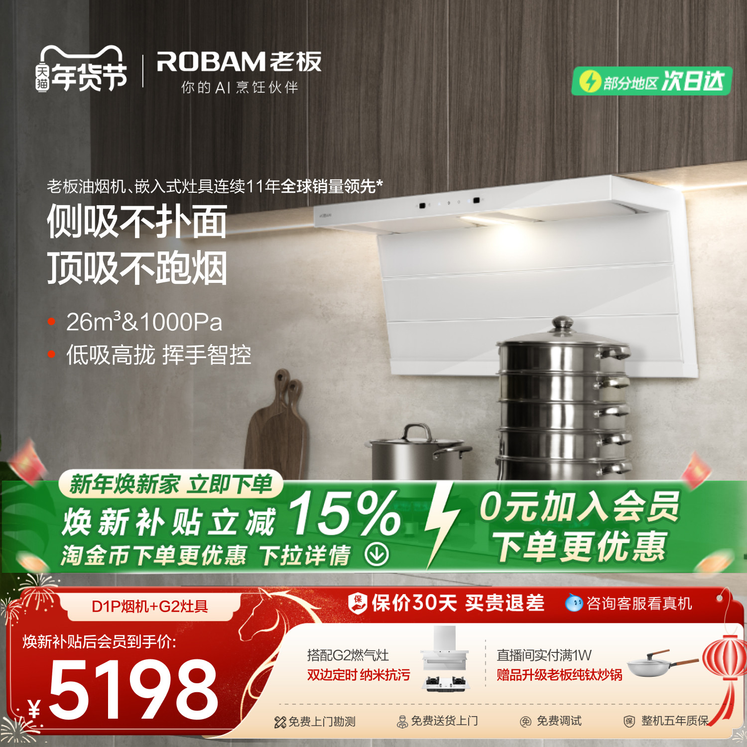 老板顶侧双吸小黑翼D1P白色套系油烟机燃气灶一套烟机灶具套装