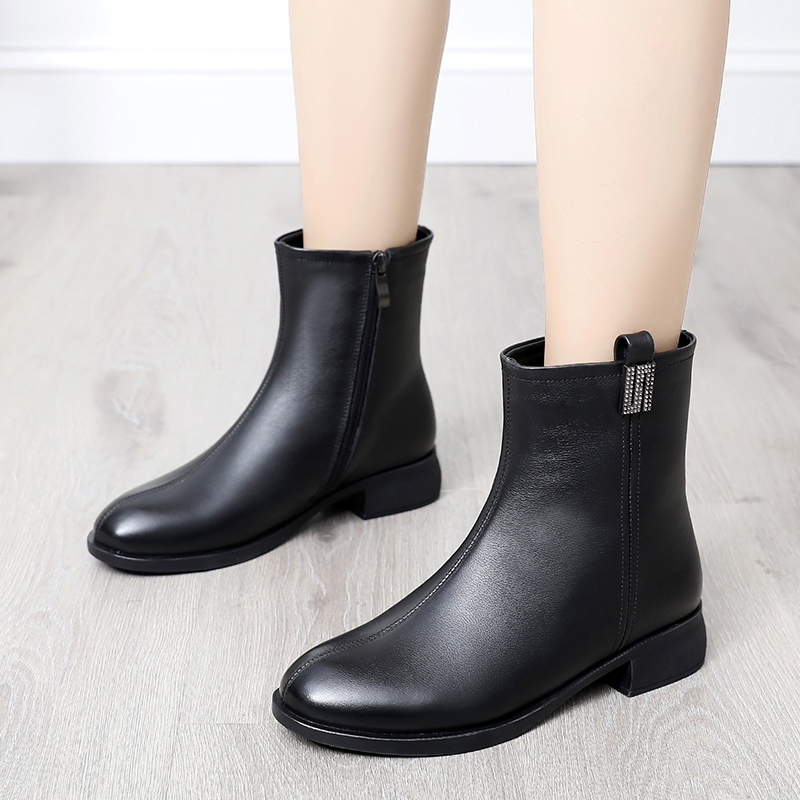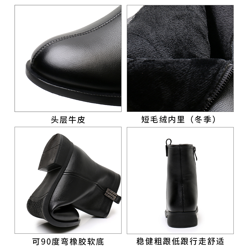 秋冬季真皮靴子平底短靴女软底全牛皮加绒中年妈妈棉鞋大码女鞋子
